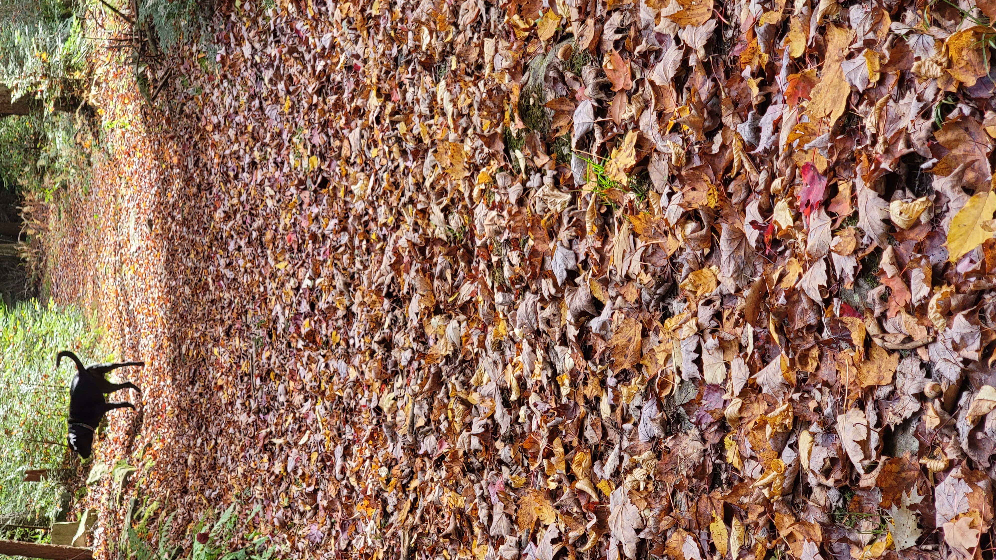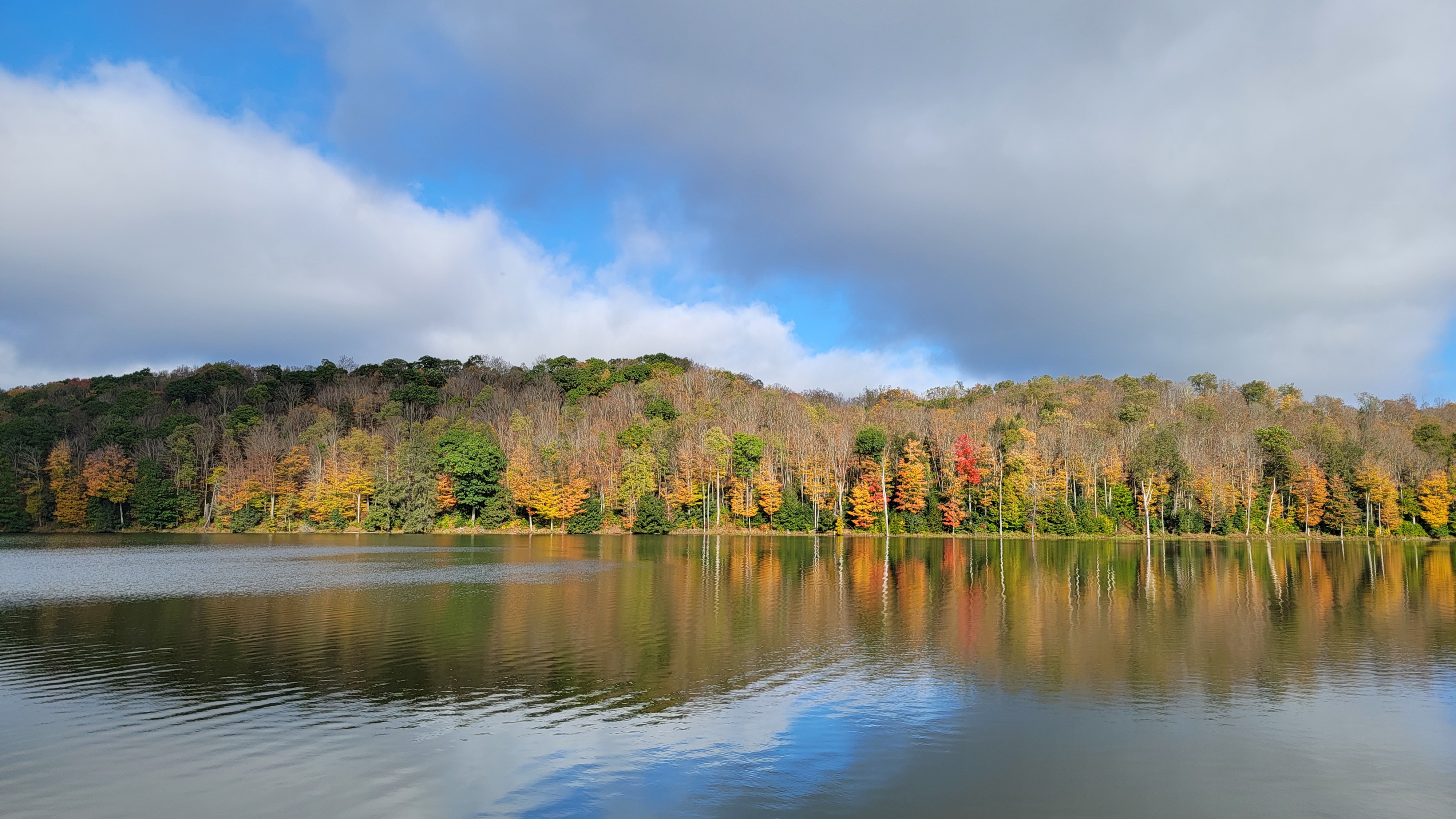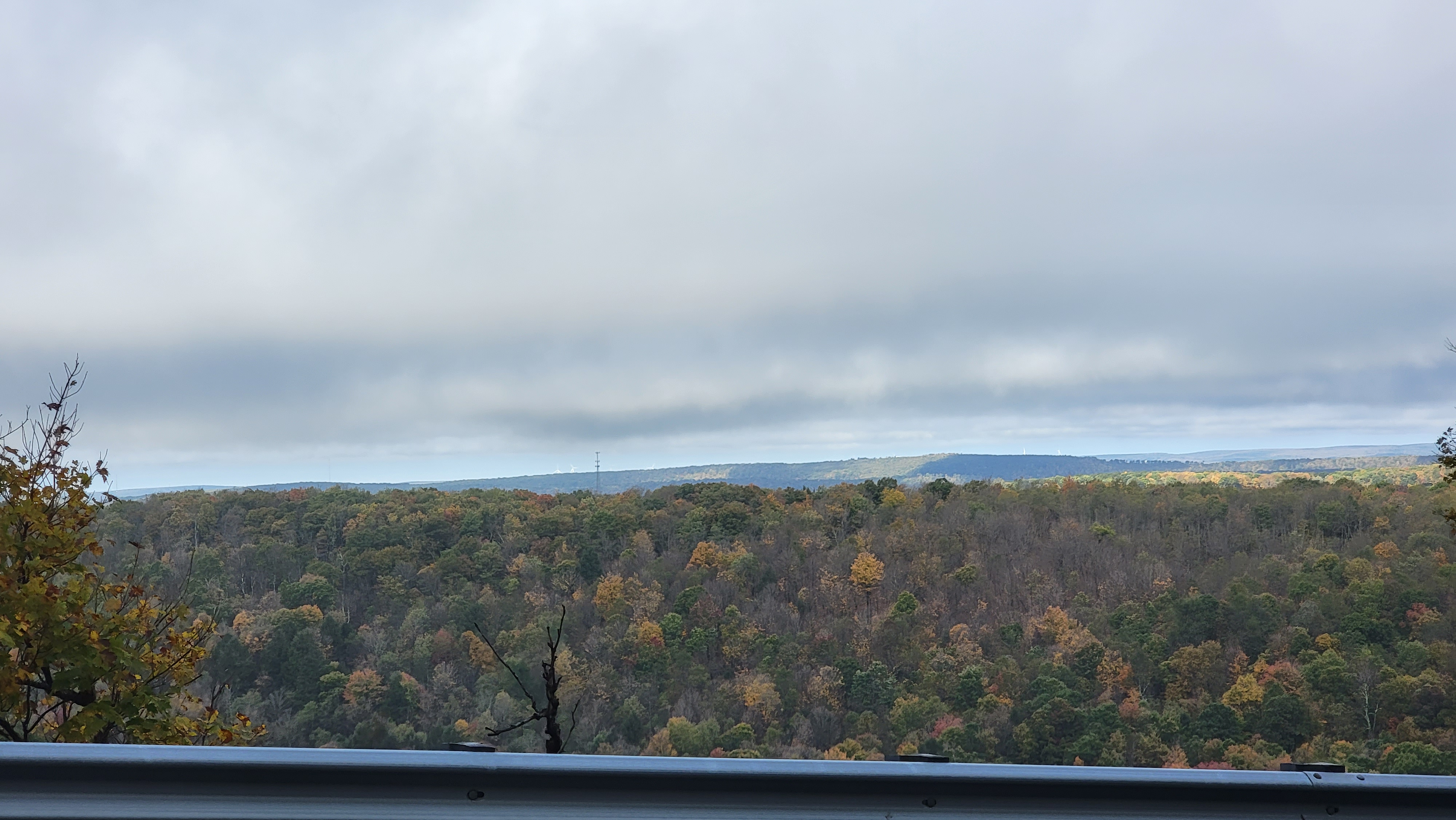 Since the last leaf update on Saturday, a significant amount of maple leaf drop has occured, and a fair amount of birch. These colors are dropping while minimal change in the Oaks. This gives a less colorful appearance, and a bit more green noticeable with the maple drop. Birch are of a vibrant yellow, but falling. Beech is a mix of their rusty appearance and some green and some have dropped. Hickory is yellow/Brown, some drop, some pockets of greens. Cherry has pretty well dropped, typical.