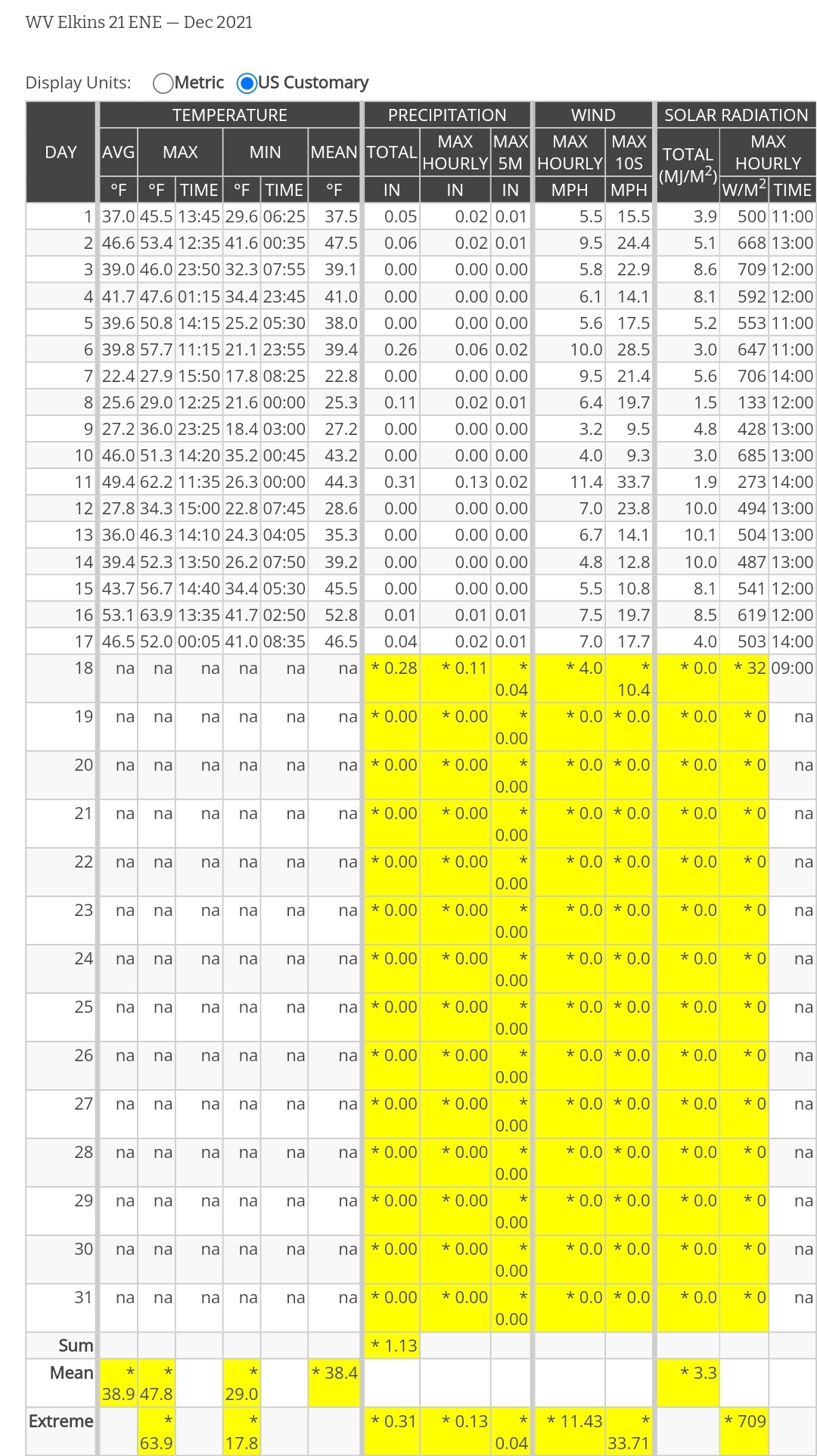 Dy007-Canaan Valley Refuge 3150′, Dy002-Cabin Mt at Bald Knob 4350′, Dy003-Cabin Mt-Western Sods 4035′, Dy004-Spruce Knob 4820′, Cvpw2-Climate Reference Network Canaan 3380′, KW99-Petersburg Grant County Airport 961′, K2G4 Garrett County Airport 2933′, KCBE Cumberland Airport 774′, KEKN Elkins Airport 1985′, KMGW Morgantown Airport 1227′