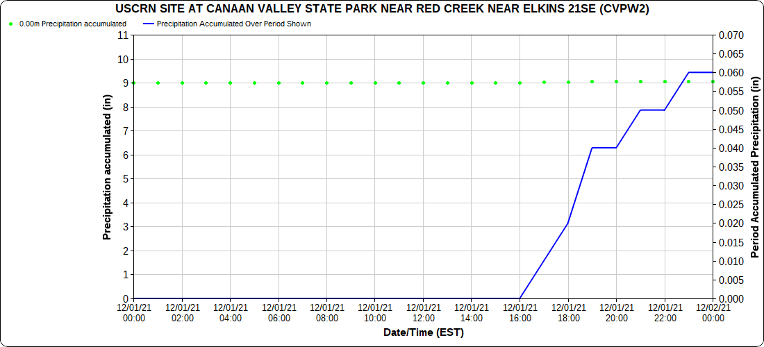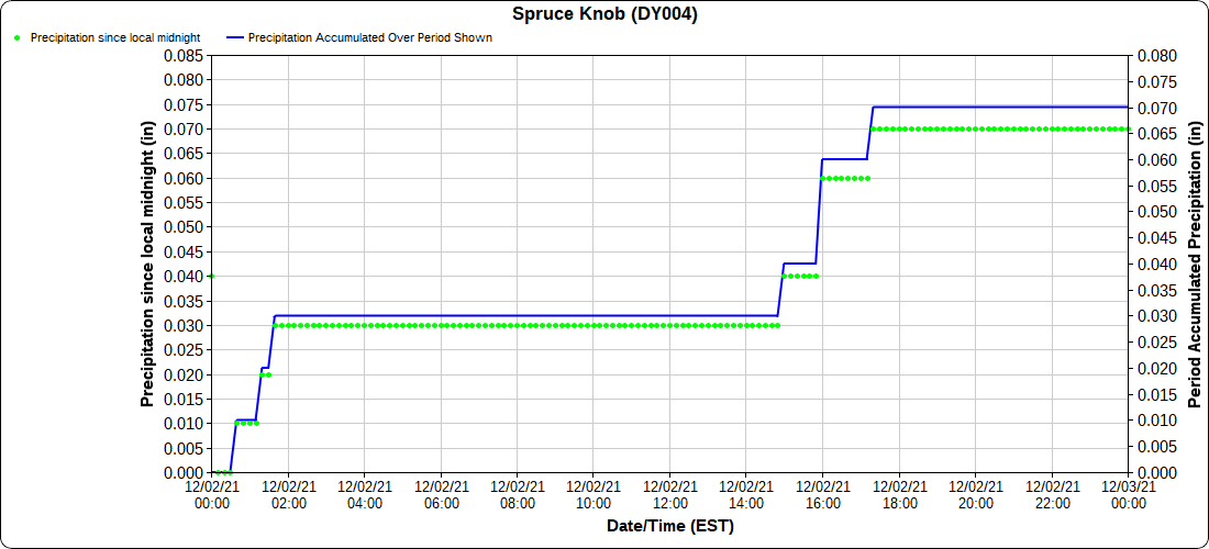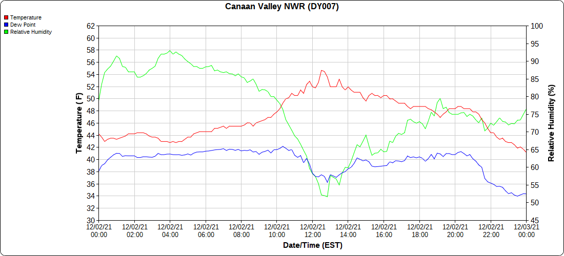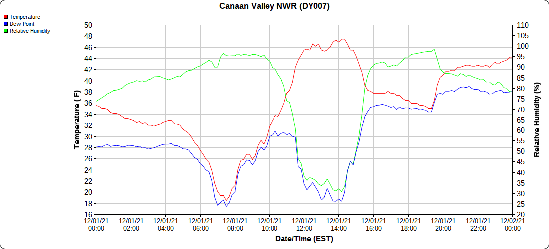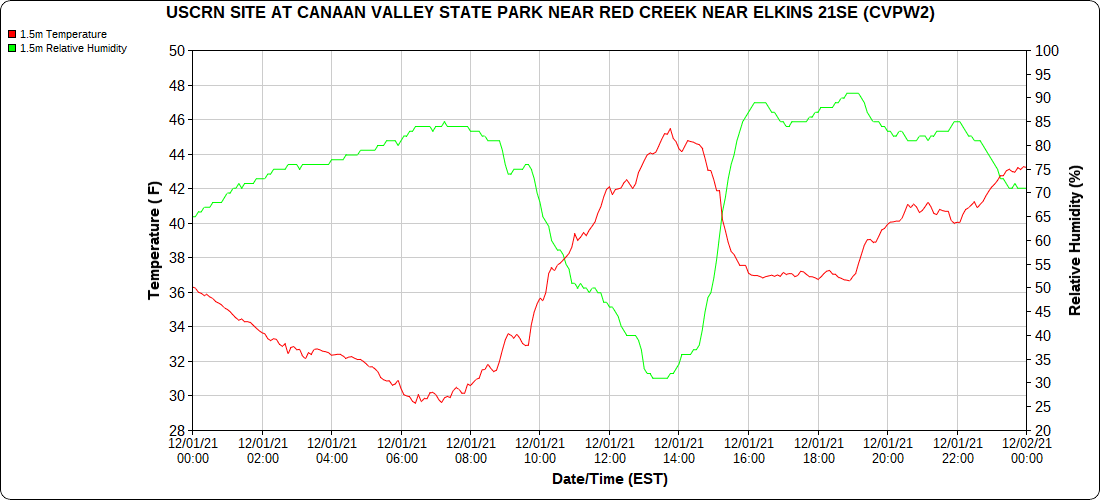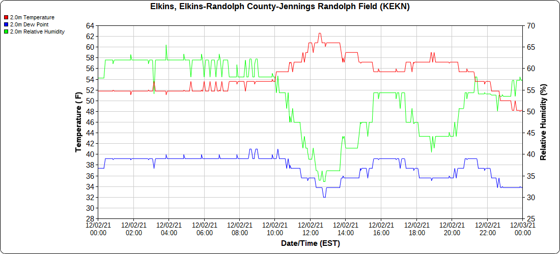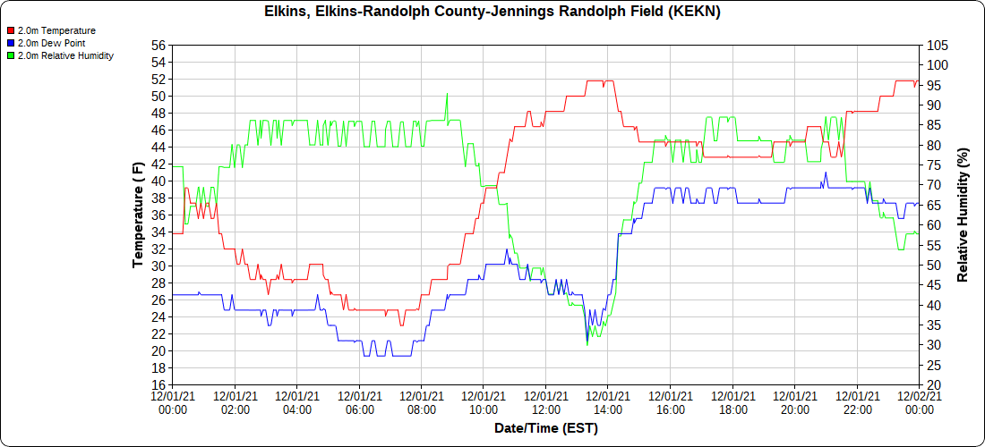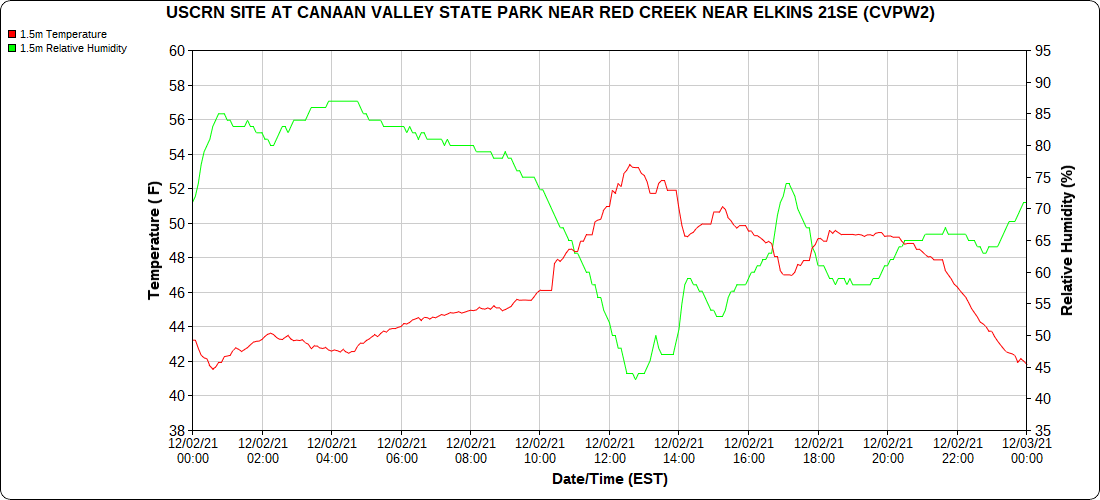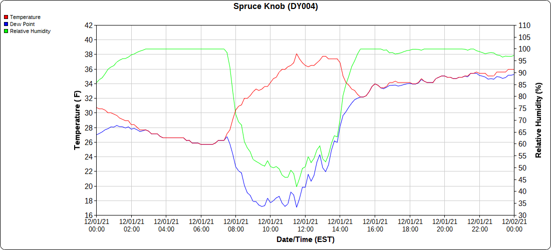 Dy007-Canaan Valley Refuge 3150′, Dy002-Cabin Mt at Bald Knob 4350′, Dy003-Cabin Mt-Western Sods 4035′, Dy004-Spruce Knob 4820′, Cvpw2-Climate Reference Network Canaan 3380′, KW99-Petersburg Grant County Airport 961′, K2G4 Garrett County Airport 2933′, KCBE Cumberland Airport 774′, KEKN Elkins Airport 1985′, KMGW Morgantown Airport
