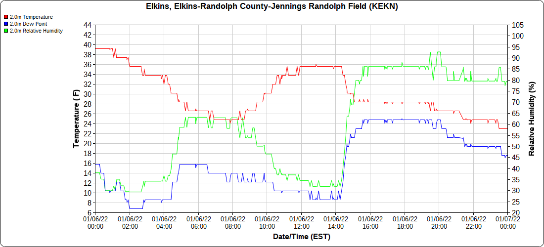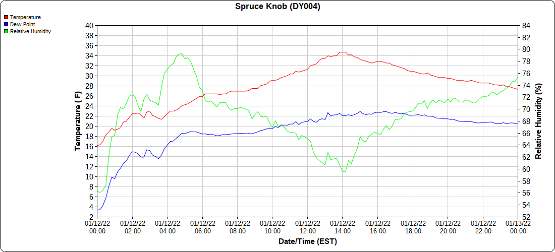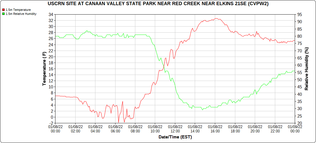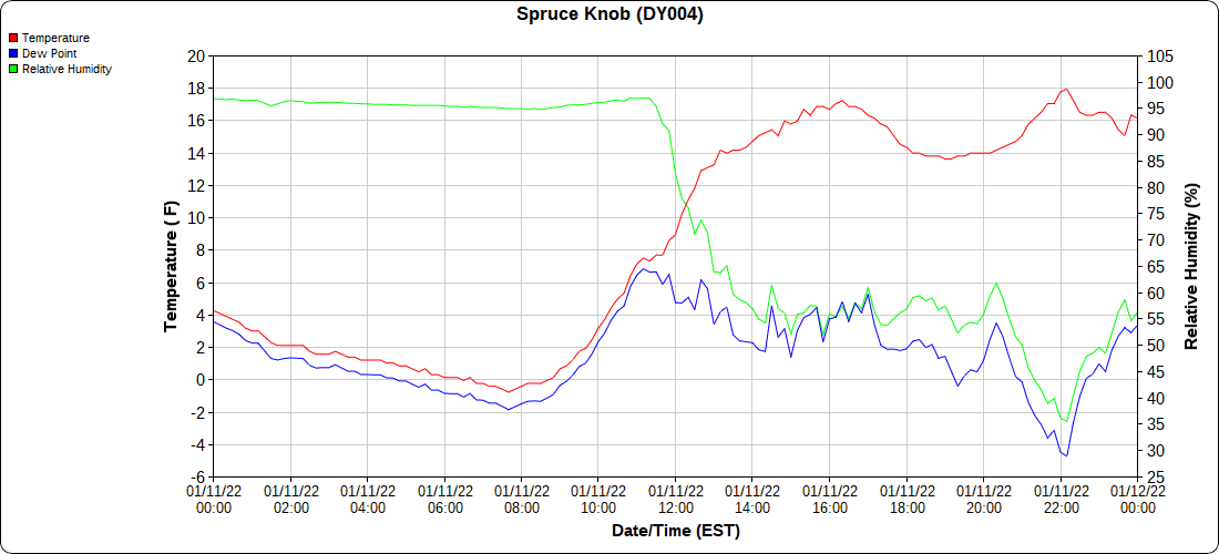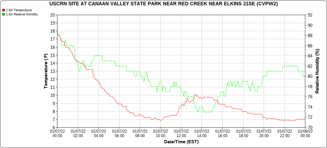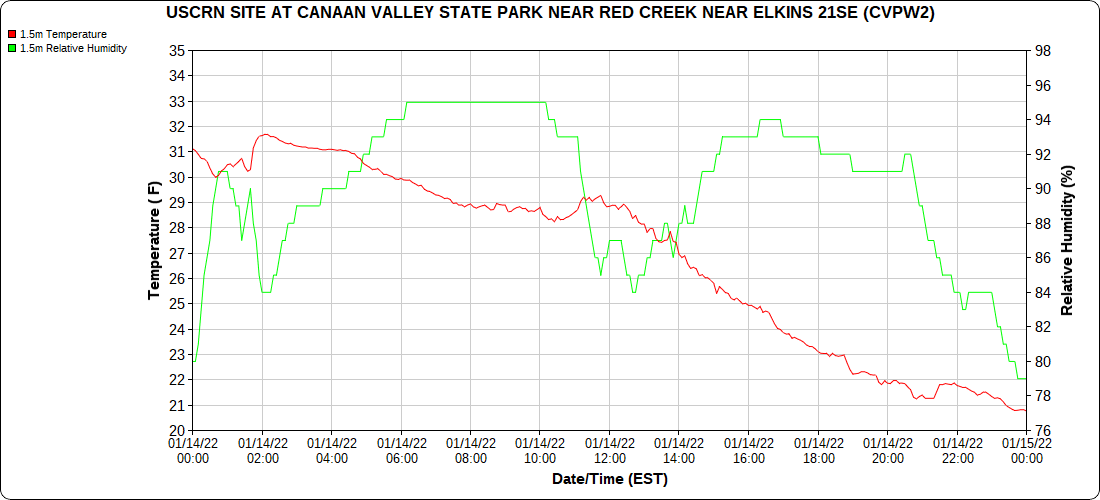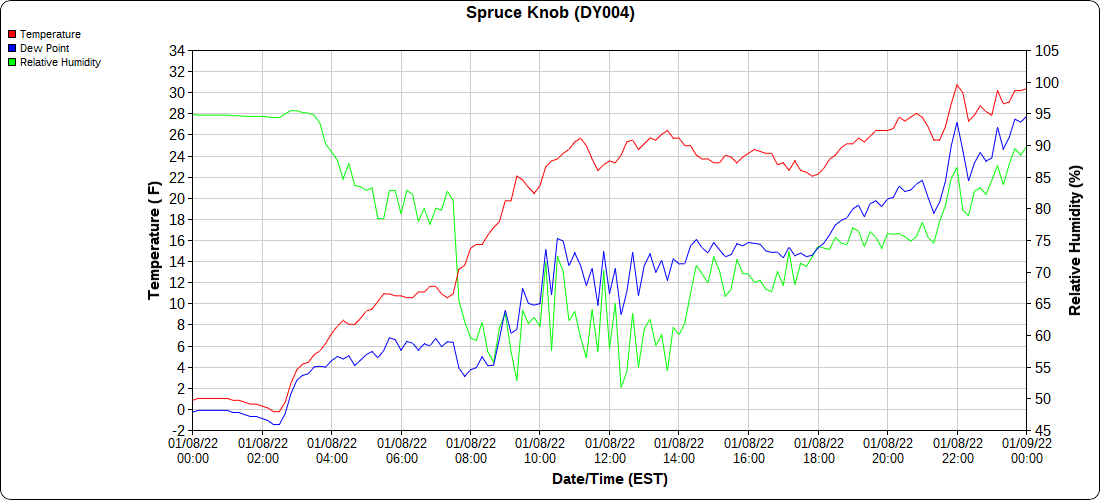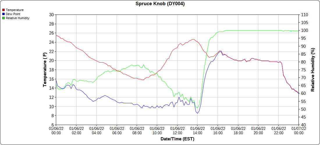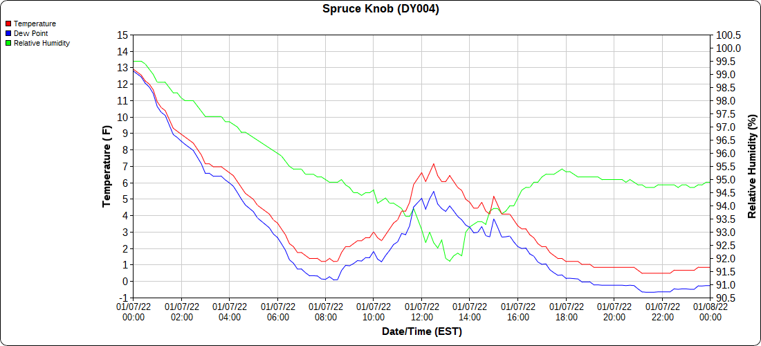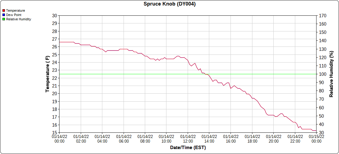 Dy007-Canaan Valley Refuge 3150′, Dy002-Cabin Mt at Bald Knob 4350′, Dy003-Cabin Mt-Western Sods 4035′, Dy004-Spruce Knob 4820′, Cvpw2-Climate Reference Network Canaan 3380′, KW99-Petersburg Grant County Airport 961′, K2G4 Garrett County Airport 2933′, KCBE Cumberland Airport 774′, KEKN Elkins Airport 1985′, KMGW Morgantown Airport 1227′