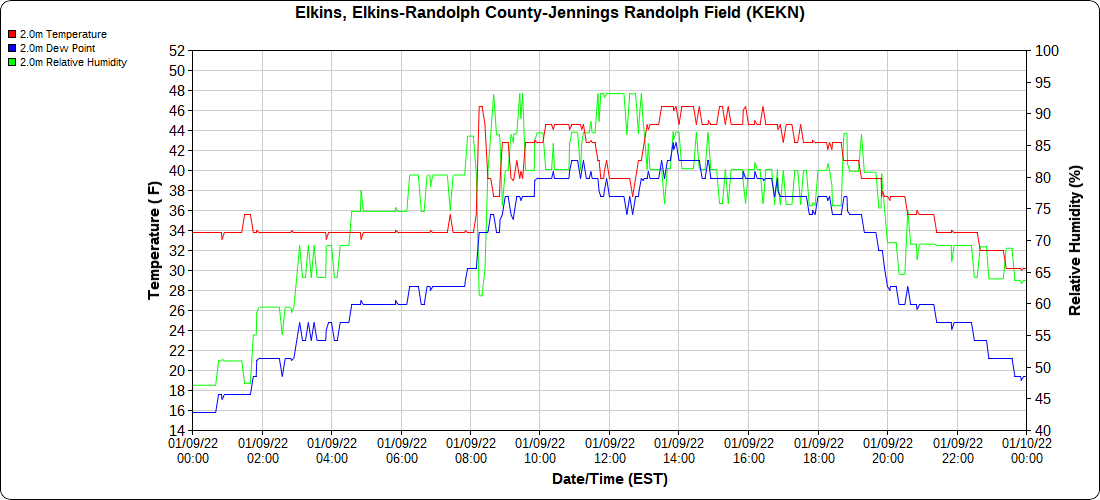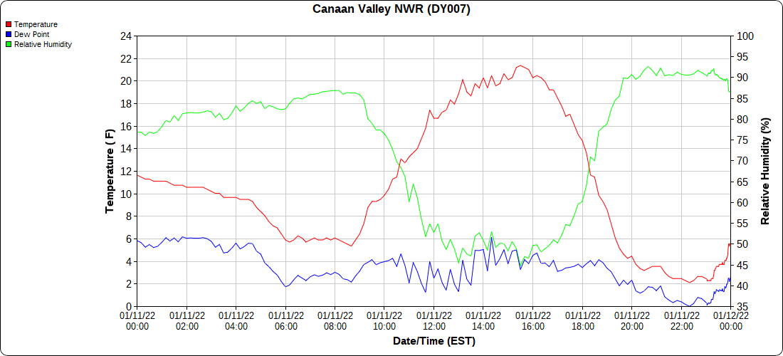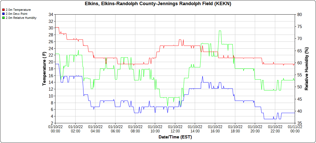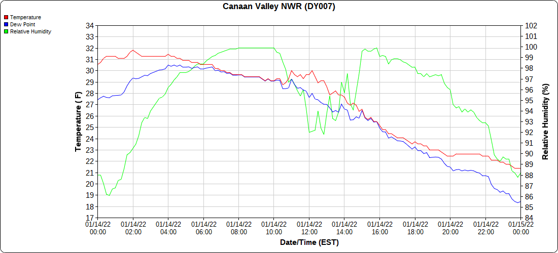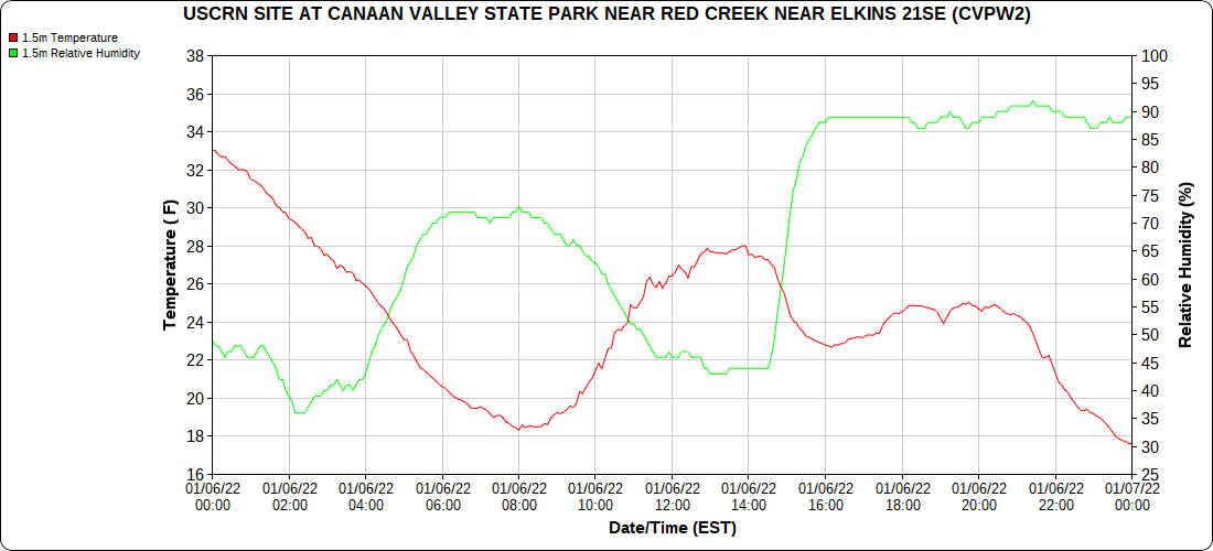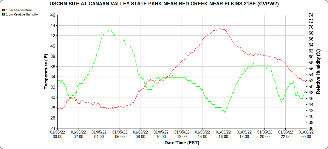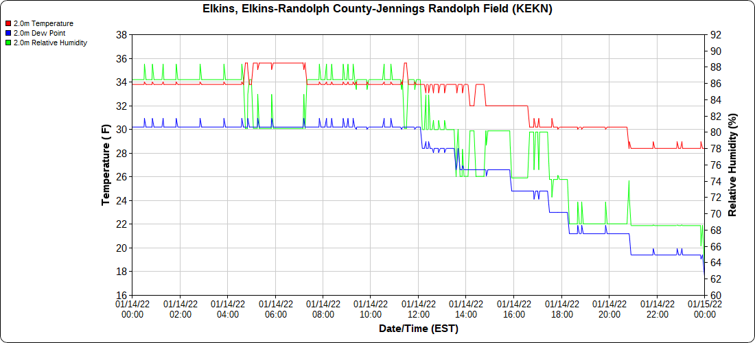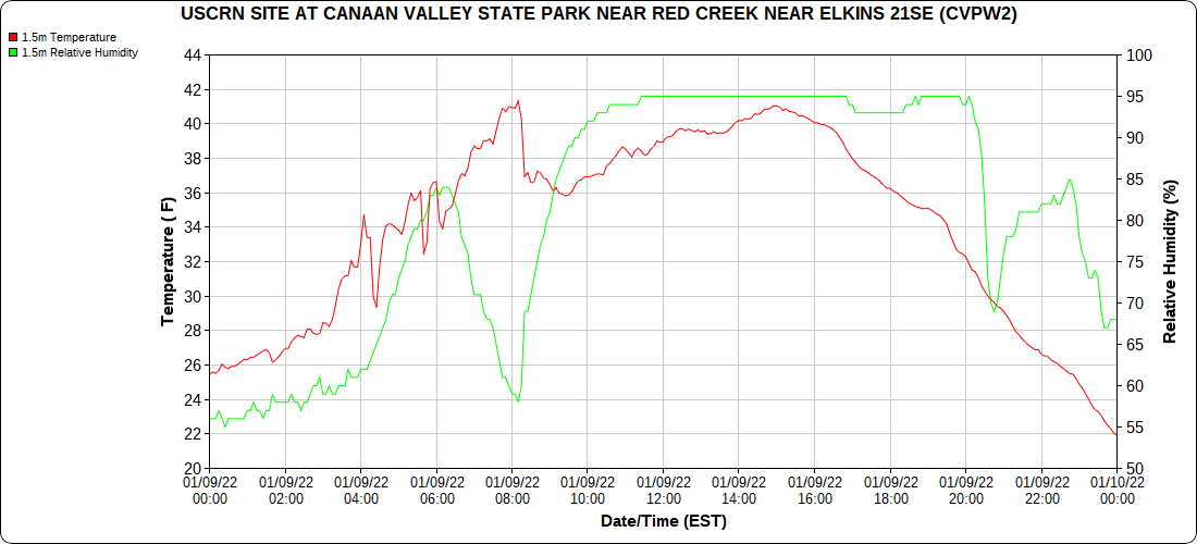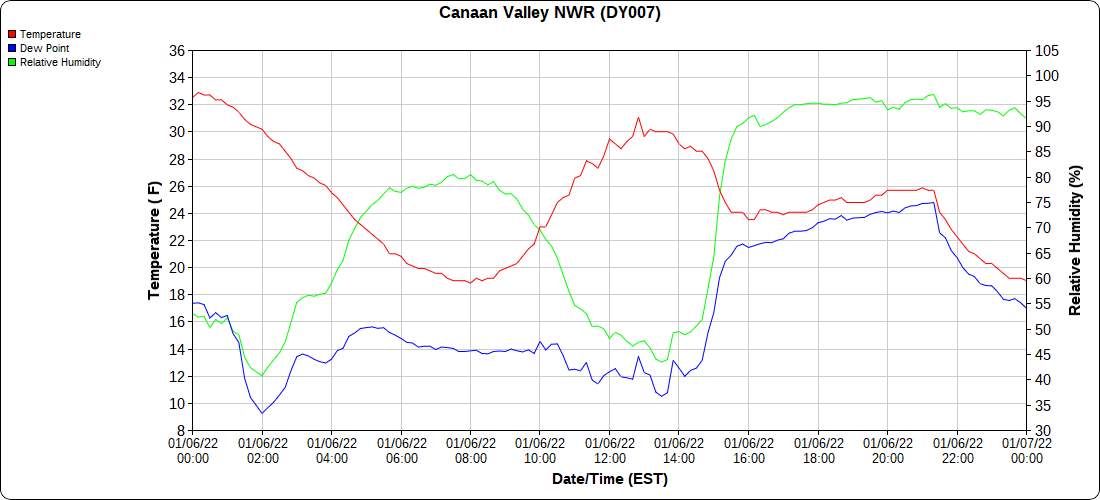 Dy007-Canaan Valley Refuge 3150′, Dy002-Cabin Mt at Bald Knob 4350′, Dy003-Cabin Mt-Western Sods 4035′, Dy004-Spruce Knob 4820′, Cvpw2-Climate Reference Network Canaan 3380′, KW99-Petersburg Grant County Airport 961′, K2G4 Garrett County Airport 2933′, KCBE Cumberland Airport 774′, KEKN Elkins Airport 1985′, KMGW Morgantown Airport 1227′