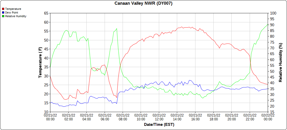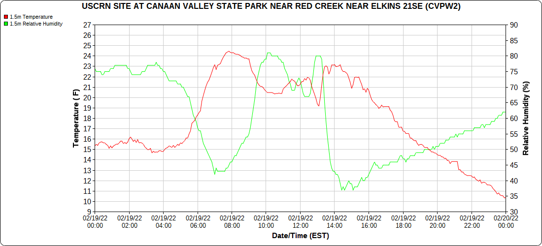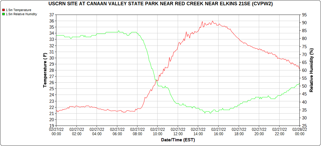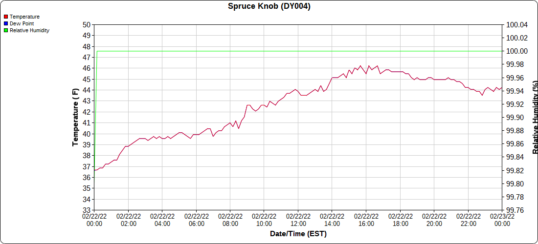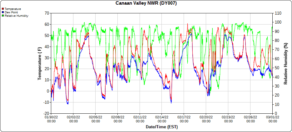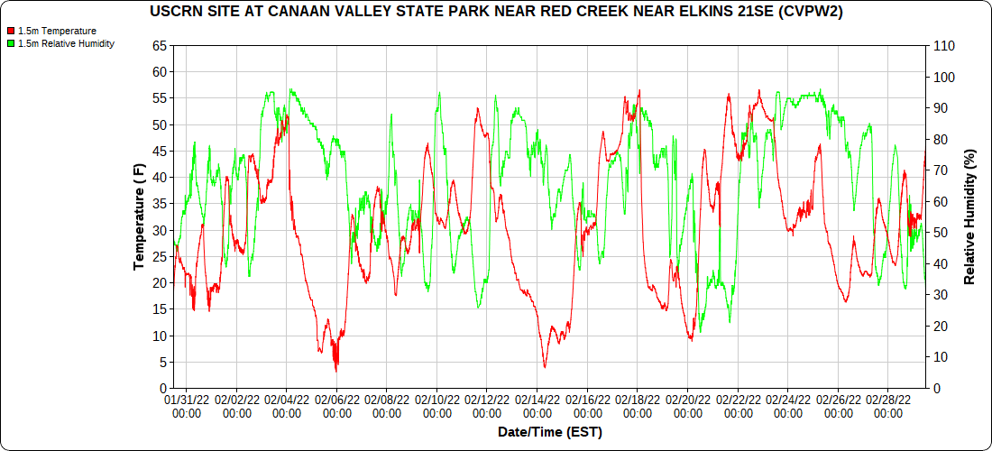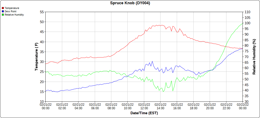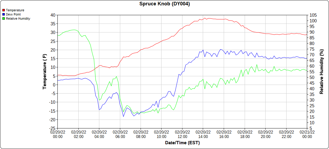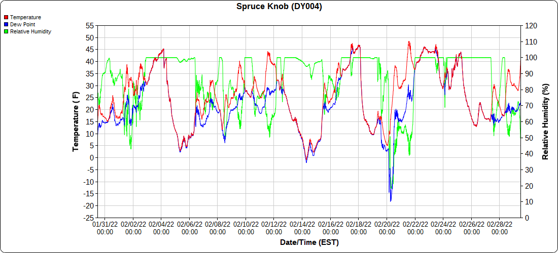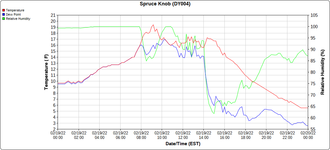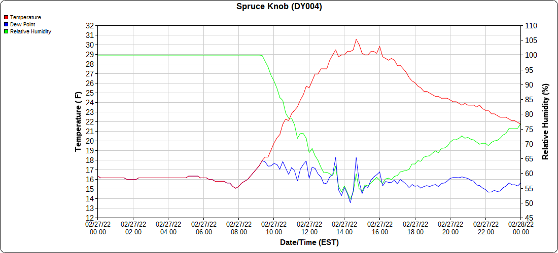 Dy007-Canaan Valley Refuge 3150′, Dy002-Cabin Mt at Bald Knob 4350′, Dy003-Cabin Mt-Western Sods 4035′, Dy004-Spruce Knob 4820′, Cvpw2-Climate Reference Network Canaan 3380′, KW99-Petersburg Grant County Airport961′, K2G4 Garrett County Airport 2933′, KCBE Cumberland Airport 774′, KEKN Elkins Airport 1985′, KMGW Morgantown Airport 1227′