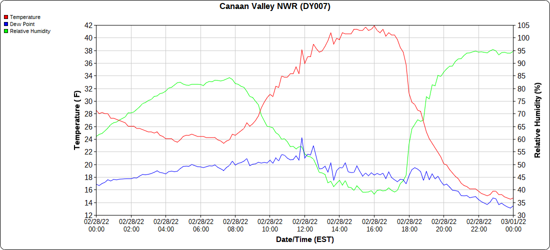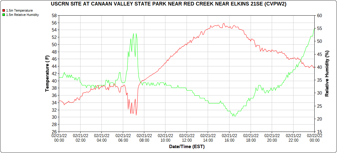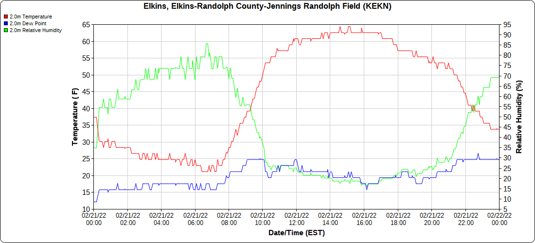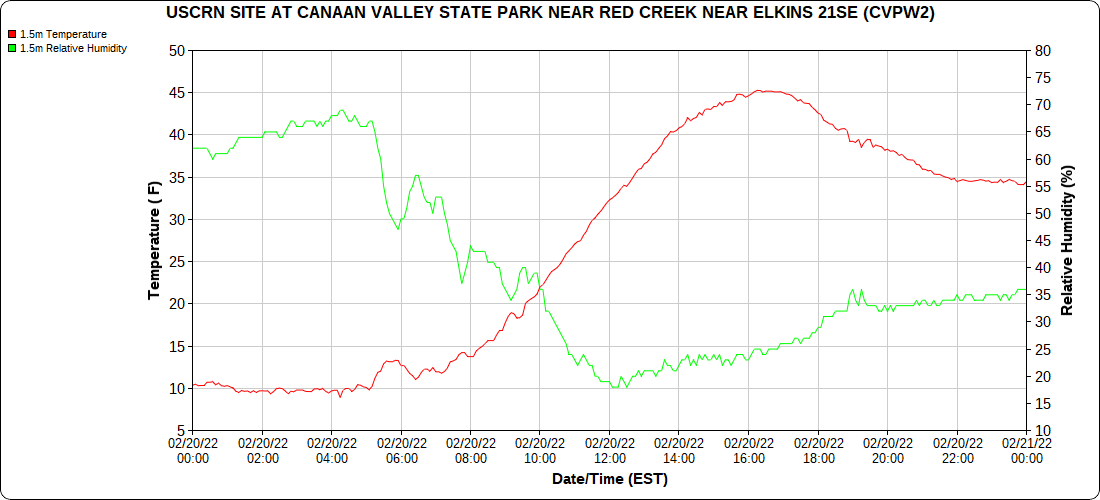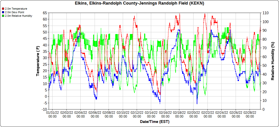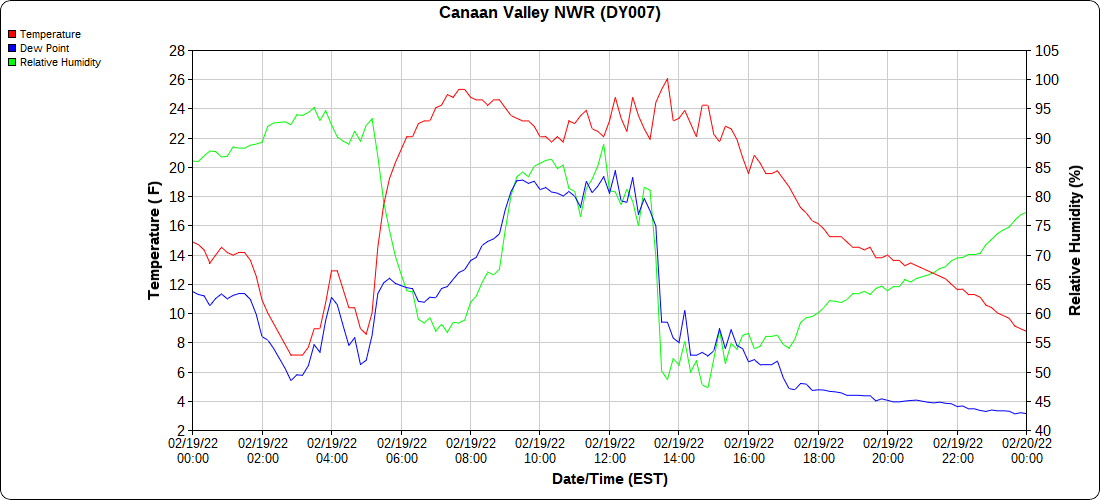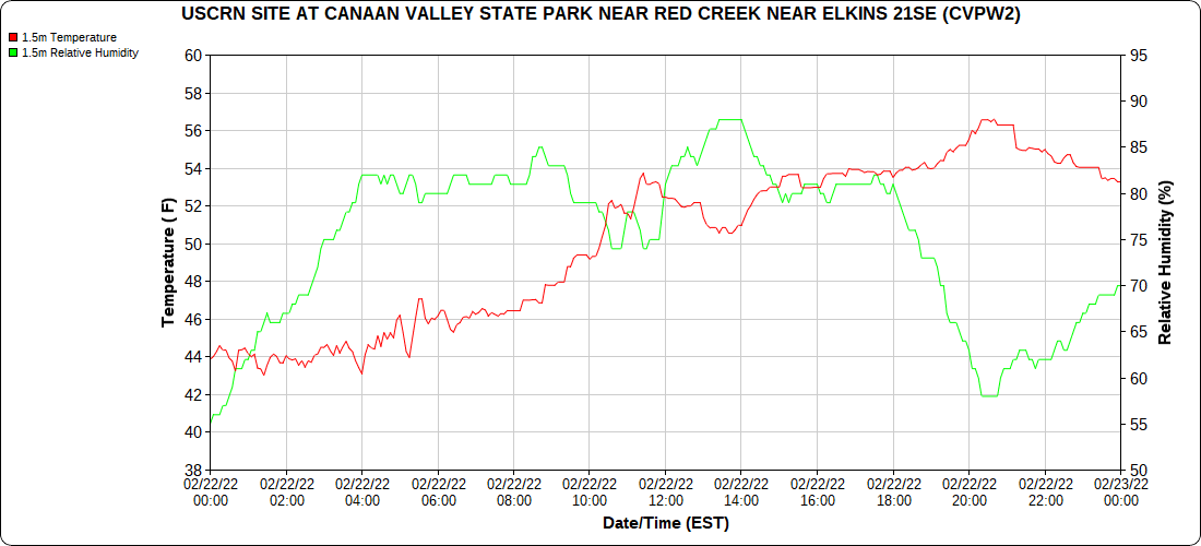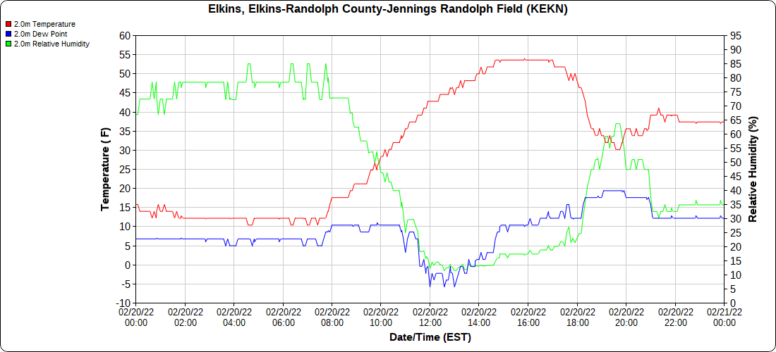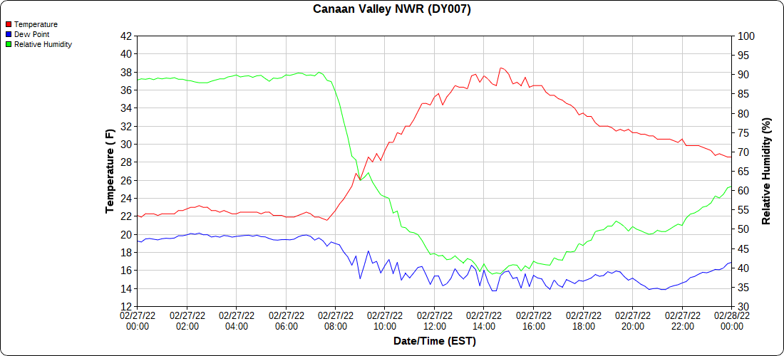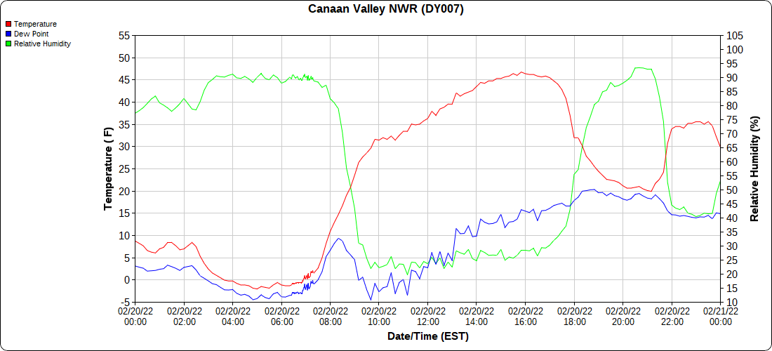 Dy007-Canaan Valley Refuge 3150′, Dy002-Cabin Mt at Bald Knob 4350′, Dy003-Cabin Mt-Western Sods 4035′, Dy004-Spruce Knob 4820′, Cvpw2-Climate Reference Network Canaan 3380′, KW99-Petersburg Grant County Airport961′, K2G4 Garrett County Airport 2933′, KCBE Cumberland Airport 774′, KEKN Elkins Airport 1985′, KMGW Morgantown Airport 1227′