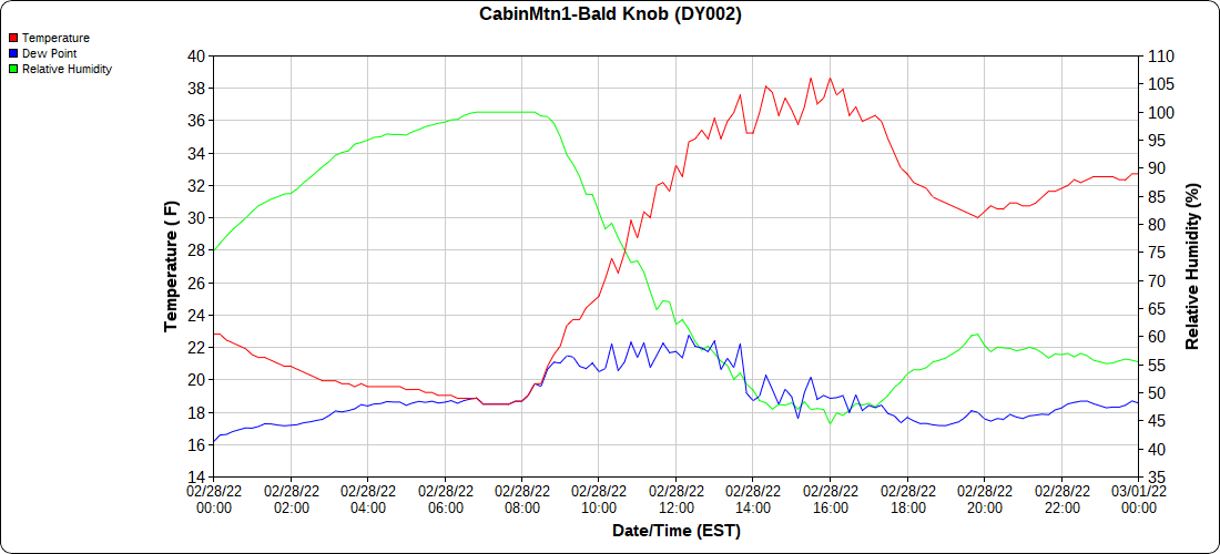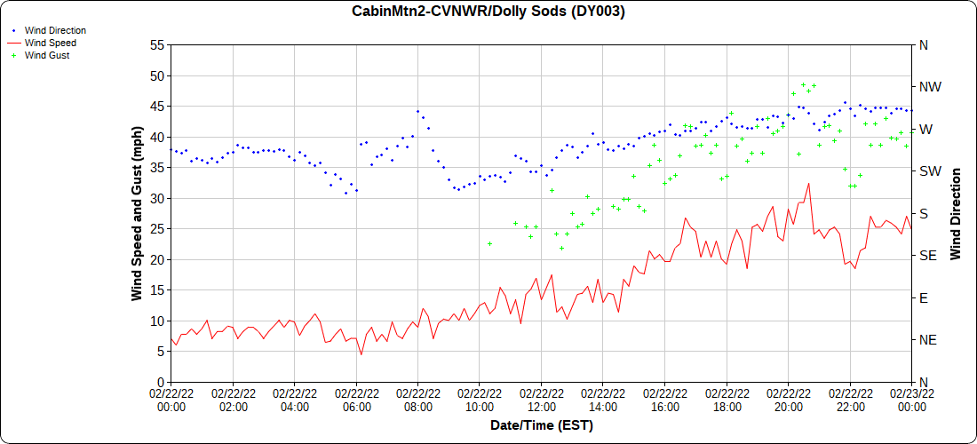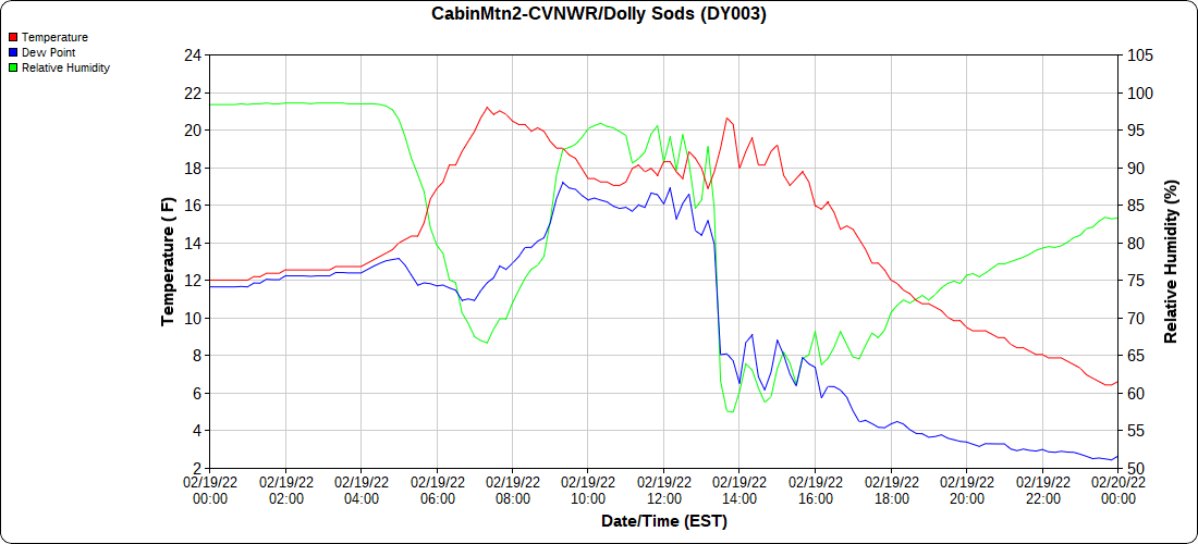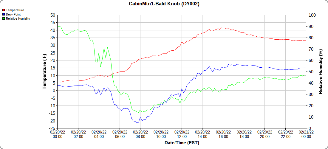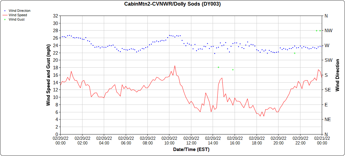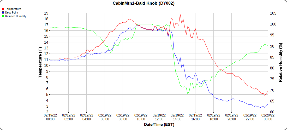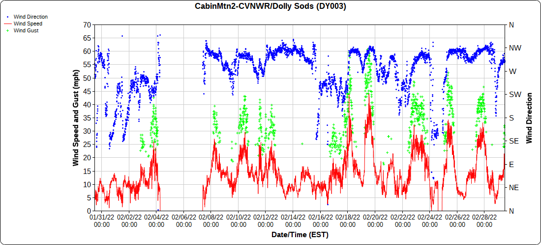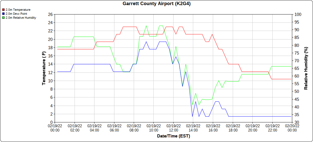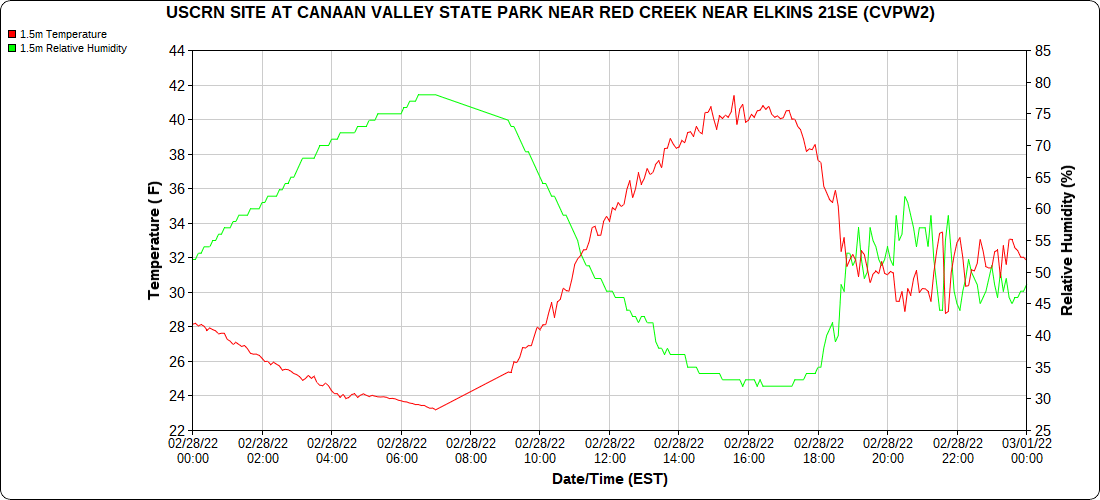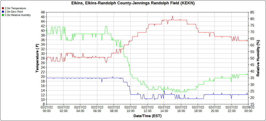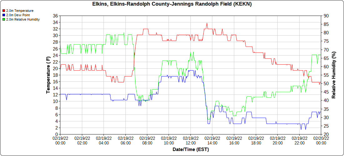 Dy007-Canaan Valley Refuge 3150′, Dy002-Cabin Mt at Bald Knob 4350′, Dy003-Cabin Mt-Western Sods 4035′, Dy004-Spruce Knob 4820′, Cvpw2-Climate Reference Network Canaan 3380′, KW99-Petersburg Grant County Airport961′, K2G4 Garrett County Airport 2933′, KCBE Cumberland Airport 774′, KEKN Elkins Airport 1985′, KMGW Morgantown Airport 1227′