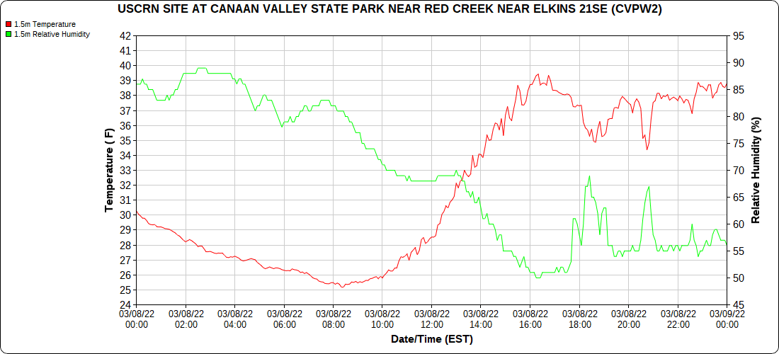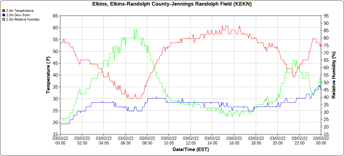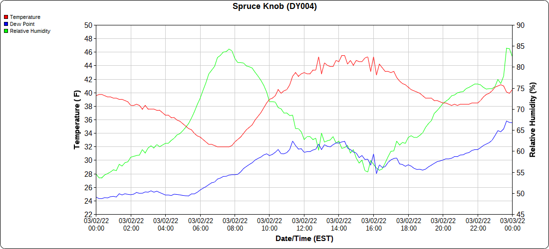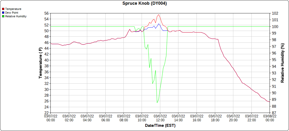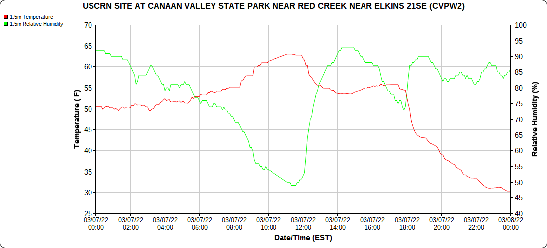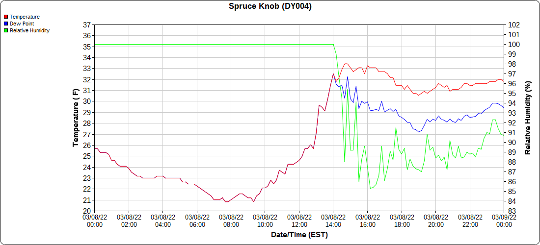 Dy007-Canaan Valley Refuge 3150′, Dy002-Cabin Mt at Bald Knob 4350′, Dy003-Cabin Mt-Western Sods 4035′, Dy004-Spruce Knob 4820′, Cvpw2-Climate Reference Network Canaan 3380′, KW99-Petersburg Grant County Airport 961′, K2G4 Garrett County Airport 2933′, KCBE Cumberland Airport 774′, KEKN Elkins Airport 1985′, KMGW Morgantown Airport 1227′