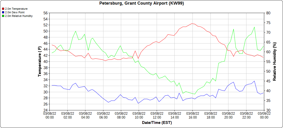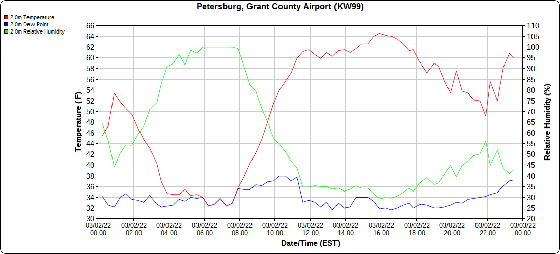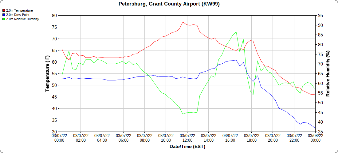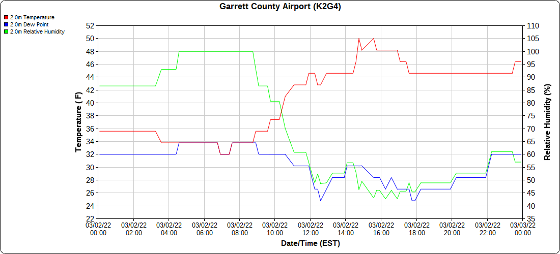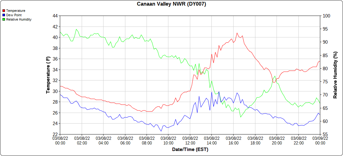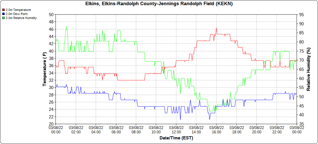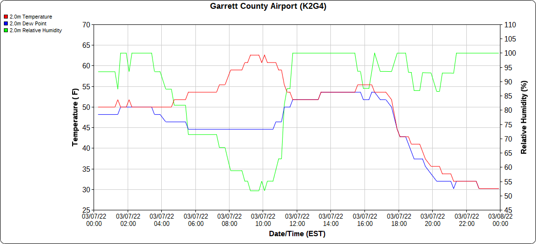 Dy007-Canaan Valley Refuge 3150′, Dy002-Cabin Mt at Bald Knob 4350′, Dy003-Cabin Mt-Western Sods 4035′, Dy004-Spruce Knob 4820′, Cvpw2-Climate Reference Network Canaan 3380′, KW99-Petersburg Grant County Airport 961′, K2G4 Garrett County Airport 2933′, KCBE Cumberland Airport 774′, KEKN Elkins Airport 1985′, KMGW Morgantown Airport 1227′