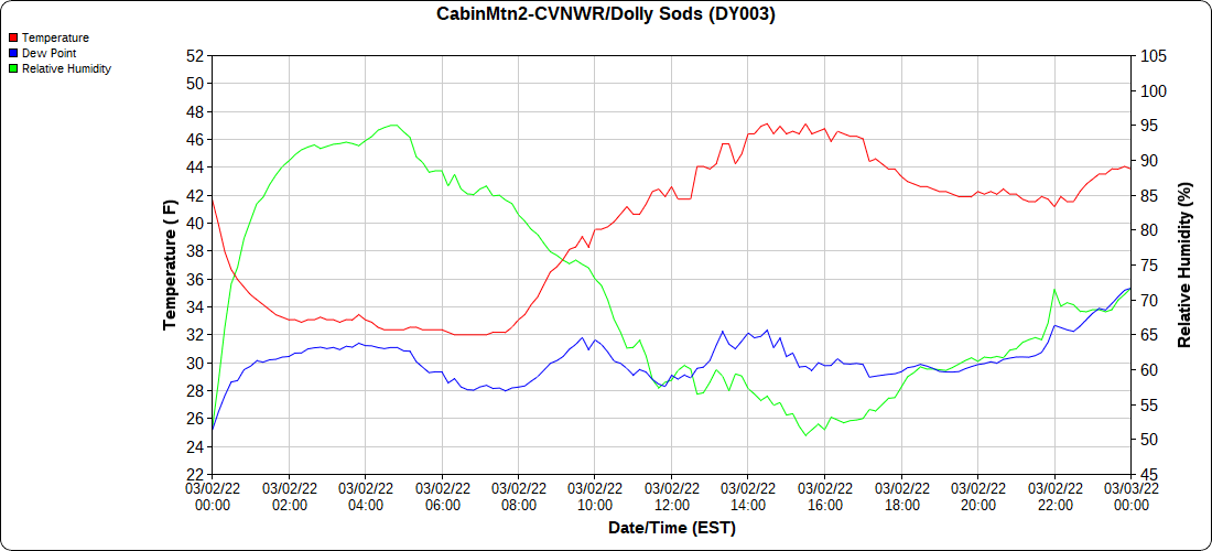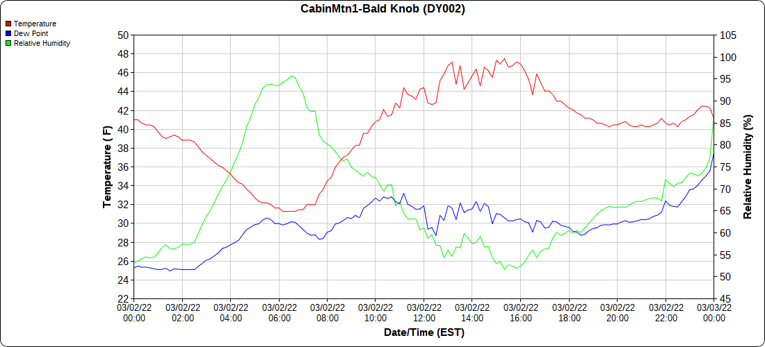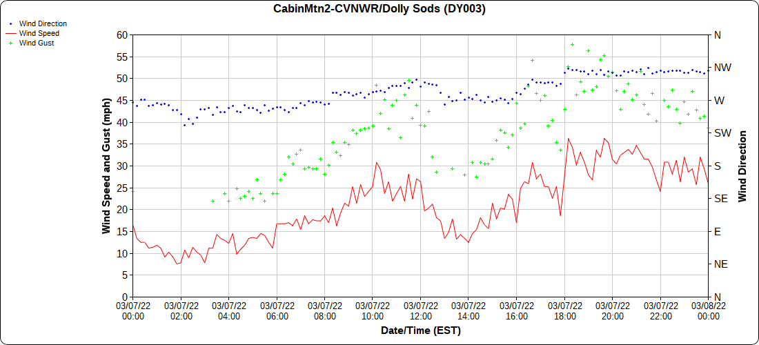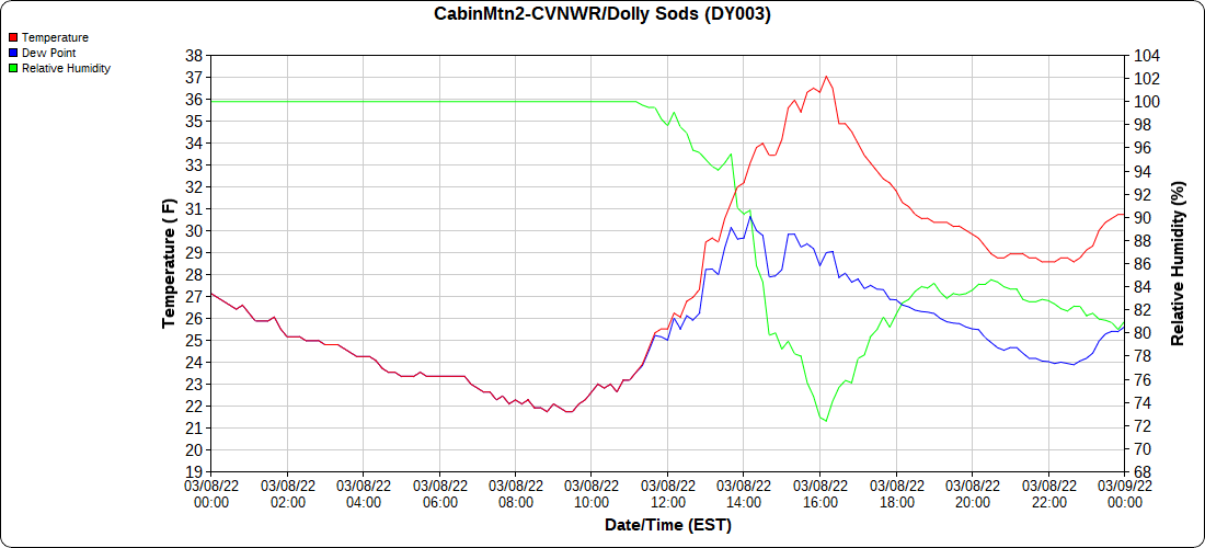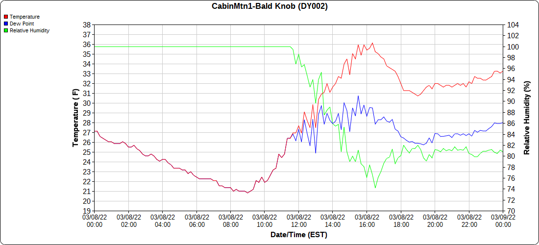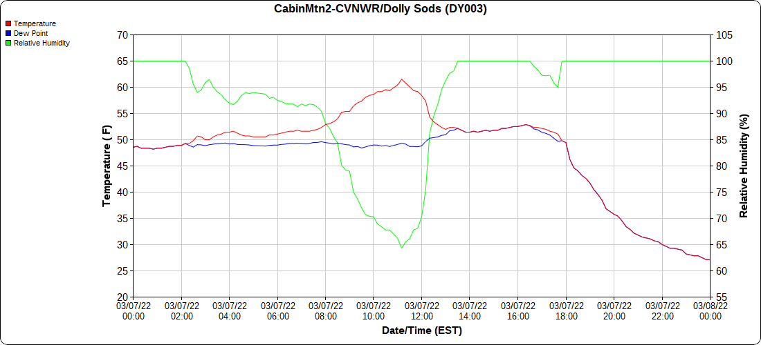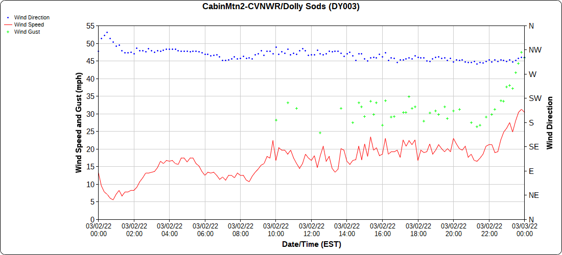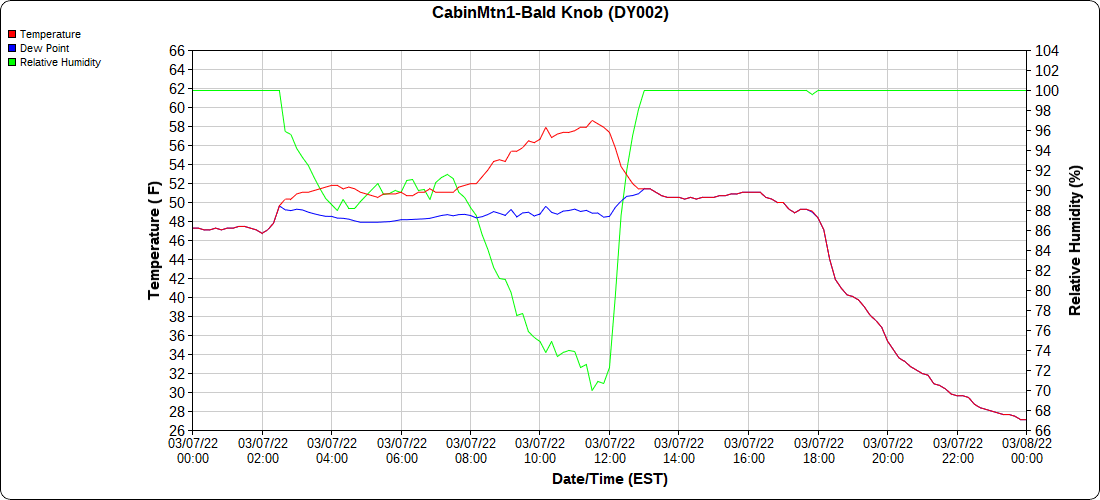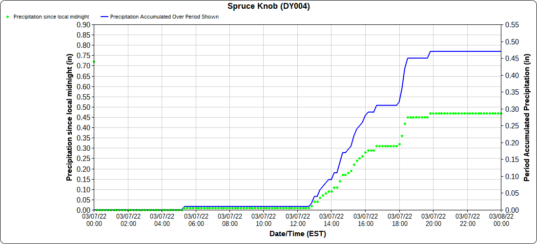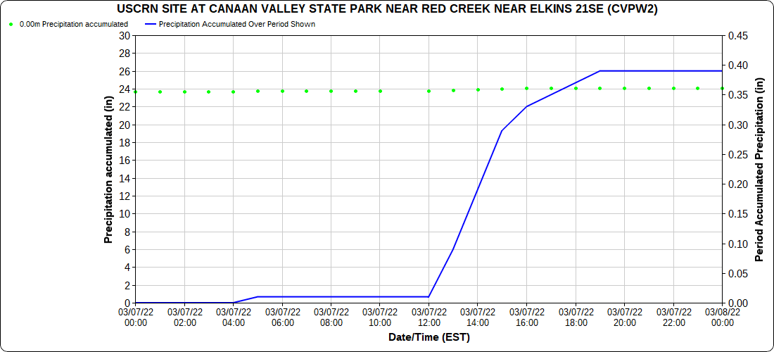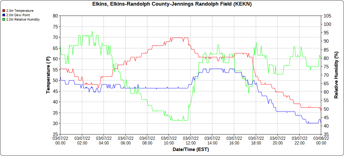 Dy007-Canaan Valley Refuge 3150′, Dy002-Cabin Mt at Bald Knob 4350′, Dy003-Cabin Mt-Western Sods 4035′, Dy004-Spruce Knob 4820′, Cvpw2-Climate Reference Network Canaan 3380′, KW99-Petersburg Grant County Airport 961′, K2G4 Garrett County Airport 2933′, KCBE Cumberland Airport 774′, KEKN Elkins Airport 1985′, KMGW Morganton Airport 1227′