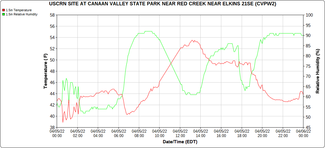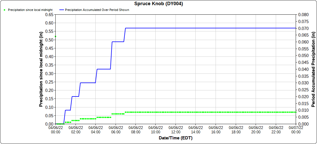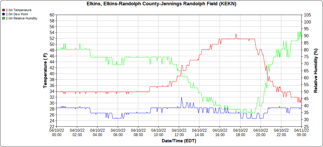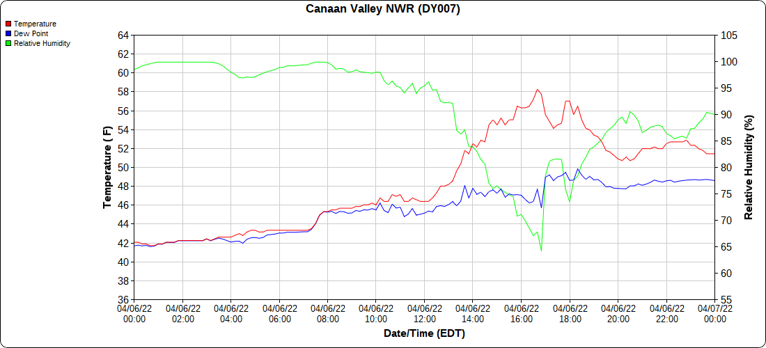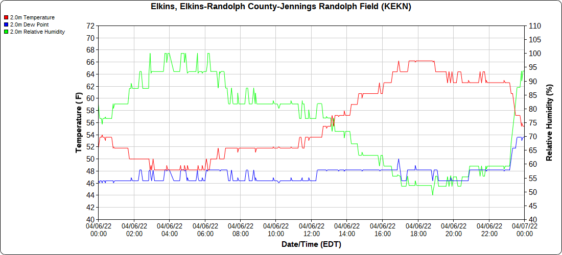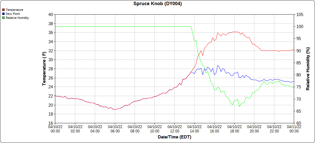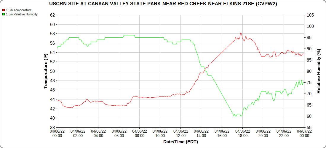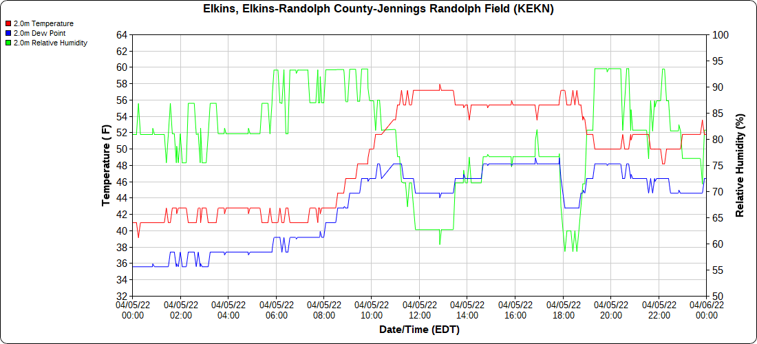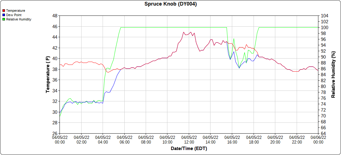 Dy007-Canaan Valley Refuge 3150′, Dy002-Cabin Mt at Bald Knob 4350′, Dy003-Cabin Mt-Western Sods 4035′, Dy004-Spruce Knob 4820′, Cvpw2-Climate Reference Network Canaan 3380′, KW99-Petersburg Grant County Airport 961′, K2G4 Garrett County Airport 2933′, KCBE Cumberland Airport 774′, KEKN Elkins Airport 1985′, KMGW Morgantown Airport 1227′