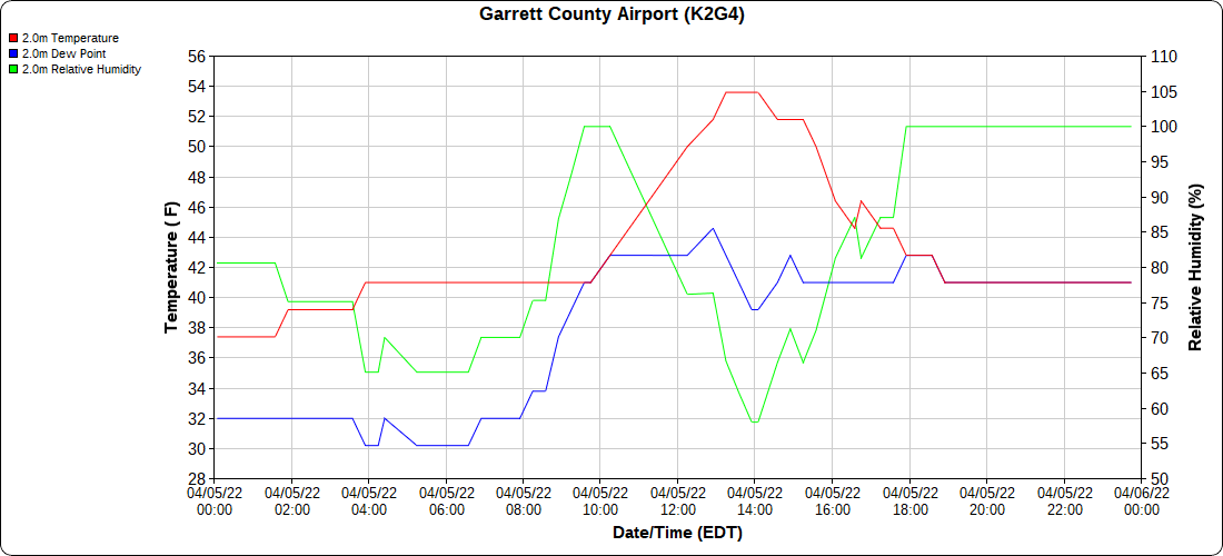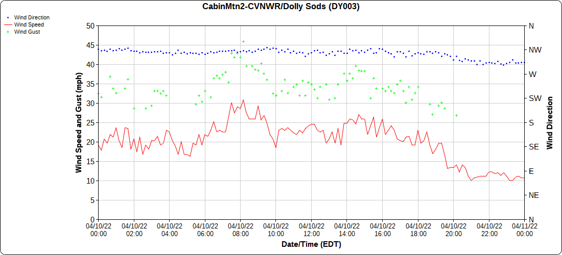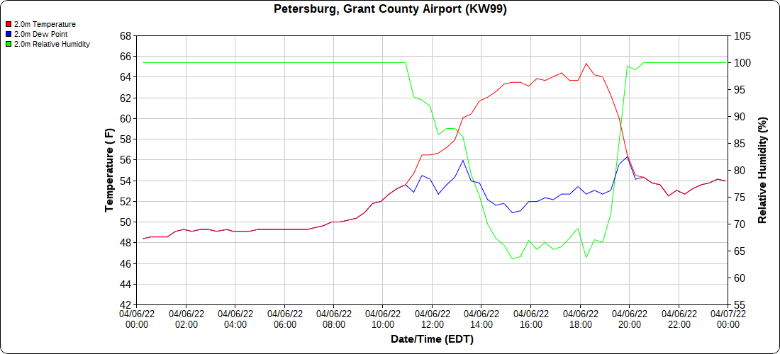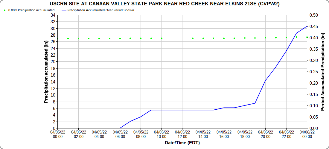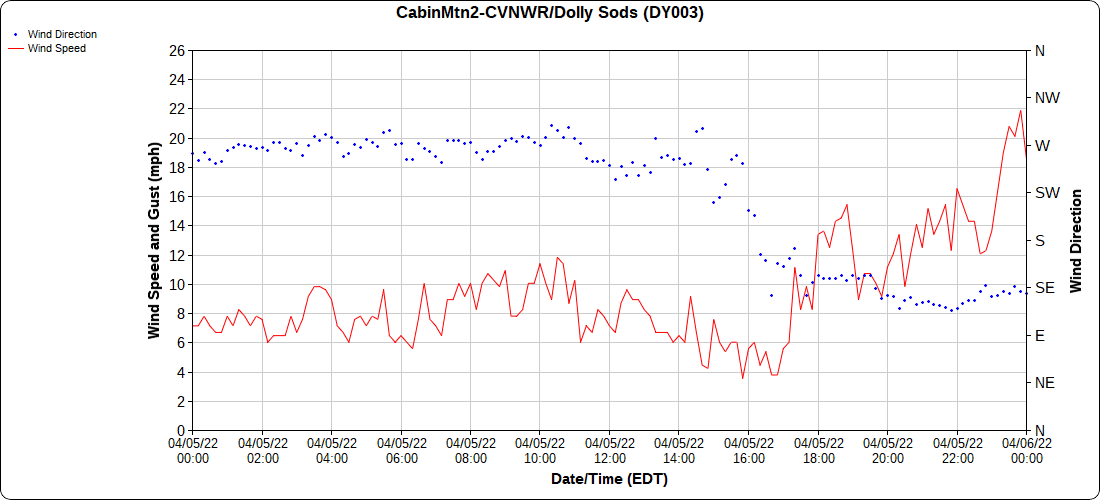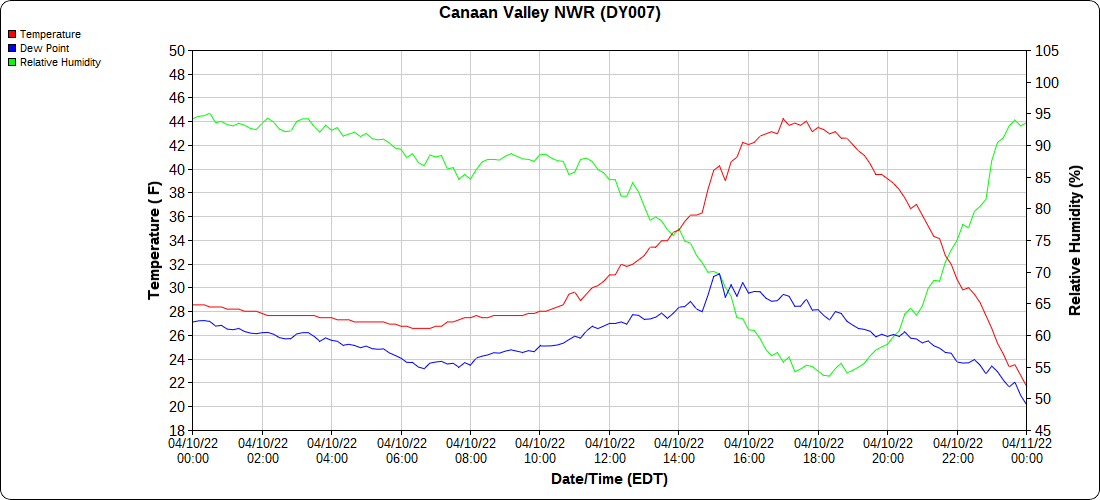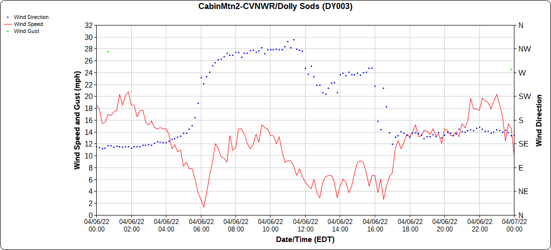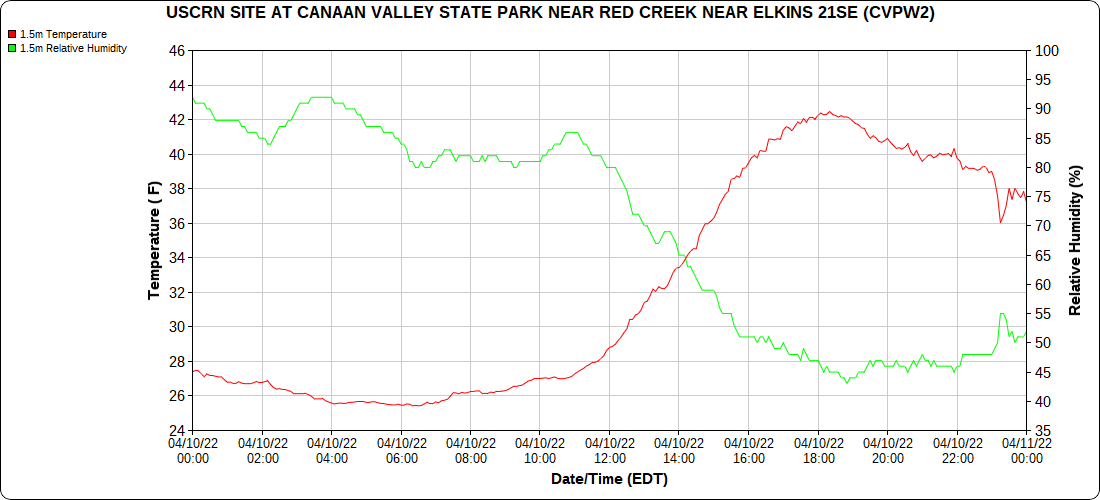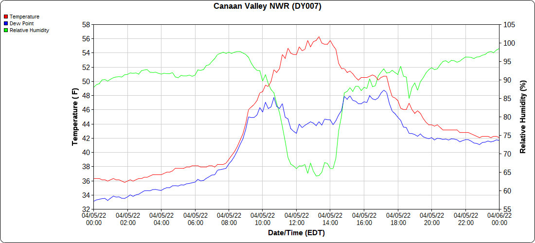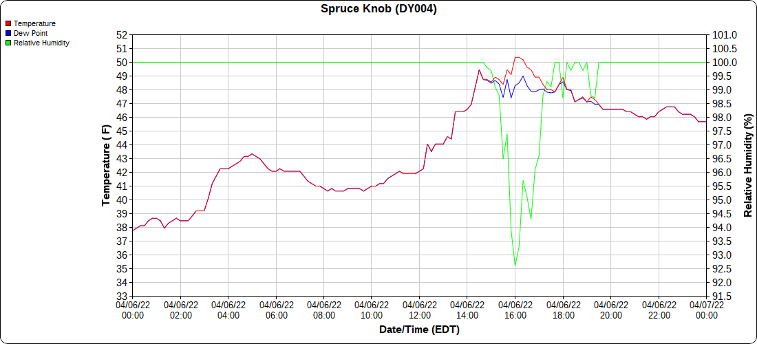 Dy007-Canaan Valley Refuge 3150′, Dy002-Cabin Mt at Bald Knob 4350′, Dy003-Cabin Mt-Western Sods 4035′, Dy004-Spruce Knob 4820′, Cvpw2-Climate Reference Network Canaan 3380′, KW99-Petersburg Grant County Airport 961′, K2G4 Garrett County Airport 2933′, KCBE Cumberland Airport 774′, KEKN Elkins Airport 1985′, KMGW Morgantown Airport 1227′