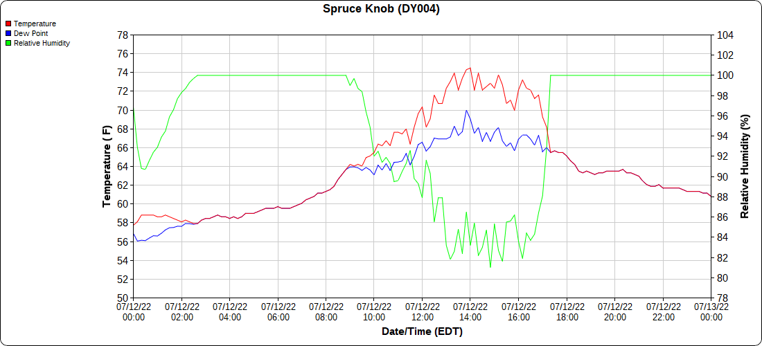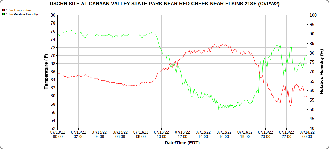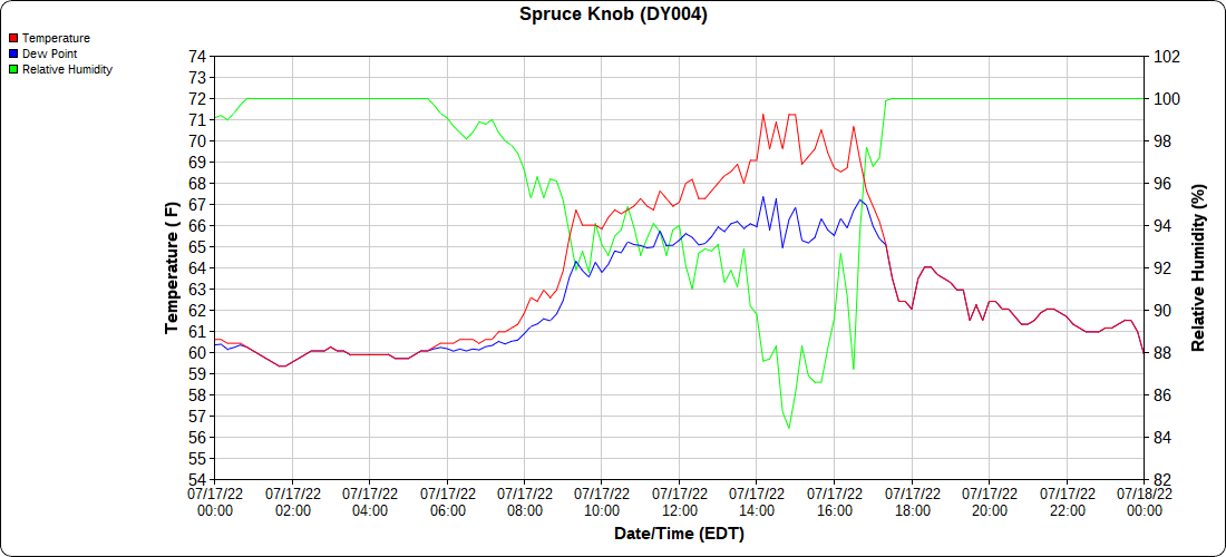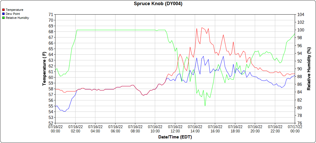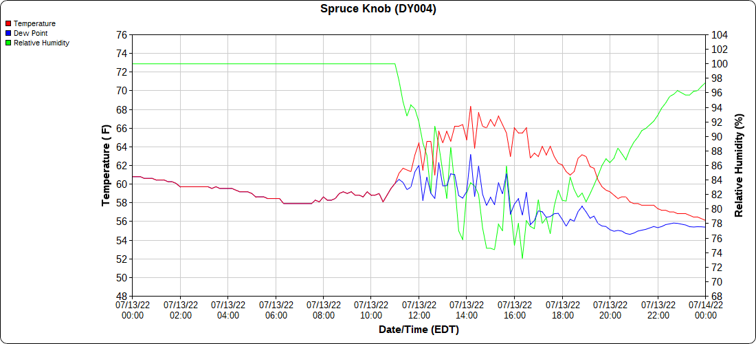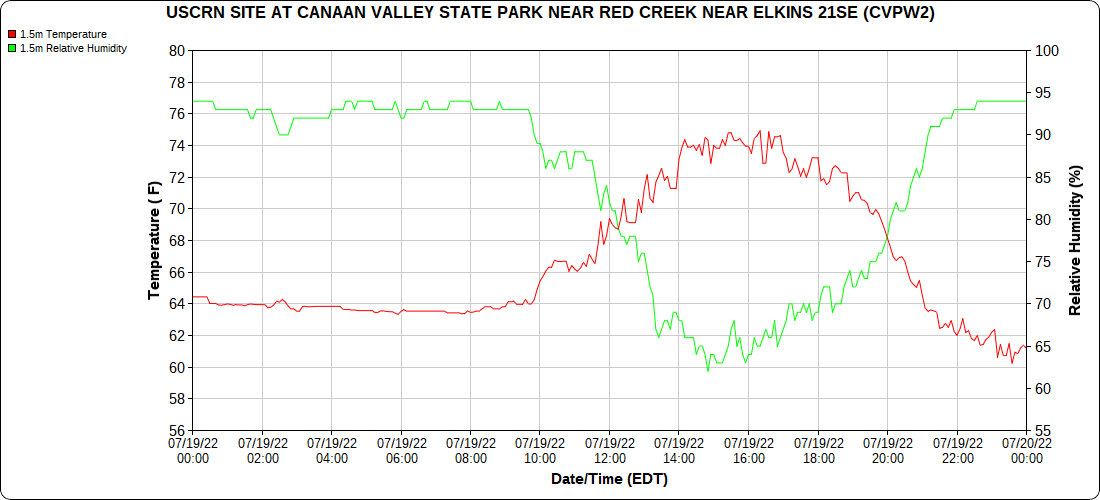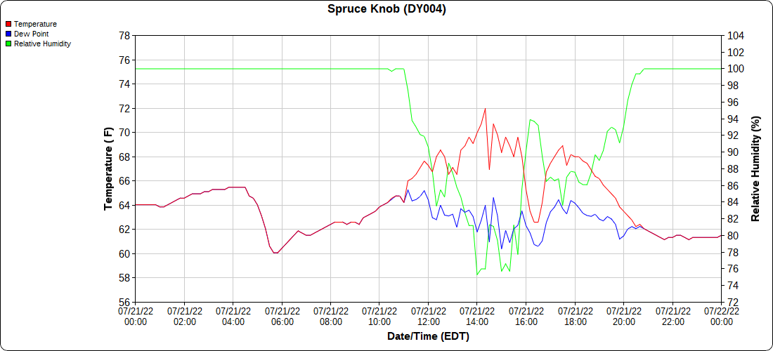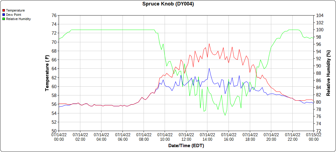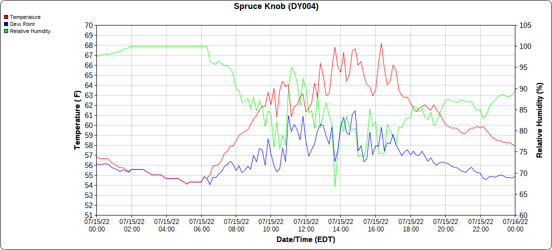 Dy007-Canaan Valley Refuge 3150′, Dy002-Cabin Mt at Bald Knob 4350′, Dy003-Cabin Mt-Western Sods 4035′, Dy004-Spruce Knob 4820′, Cvpw2-Climate Reference Network Canaan 3380′, KW99-Petersburg Grant County Airport 961, K2G4 Garrett County Airport 2933′, KCBE Cumberland Airport 774′, KEKN Elkins Airport 1985′, KMGW Morgantown Airport 1227′, PMN16-Mt. Davis 3038′