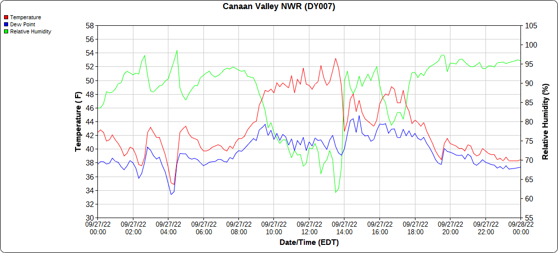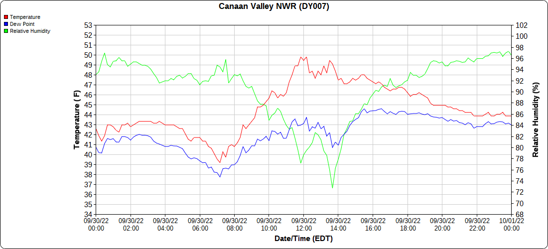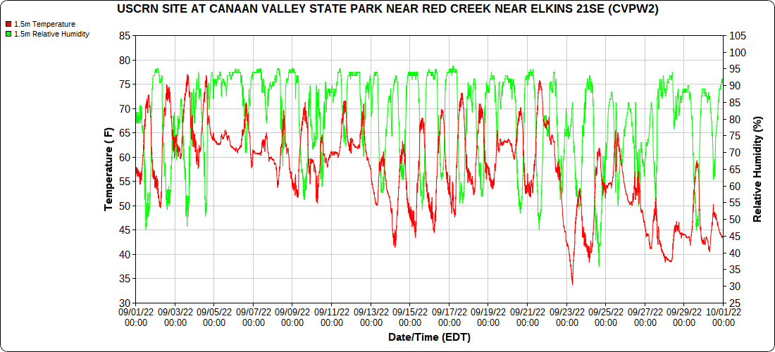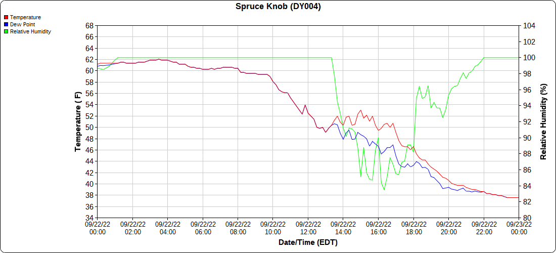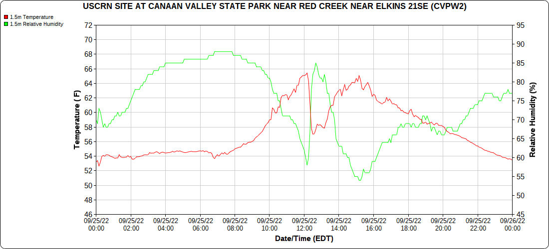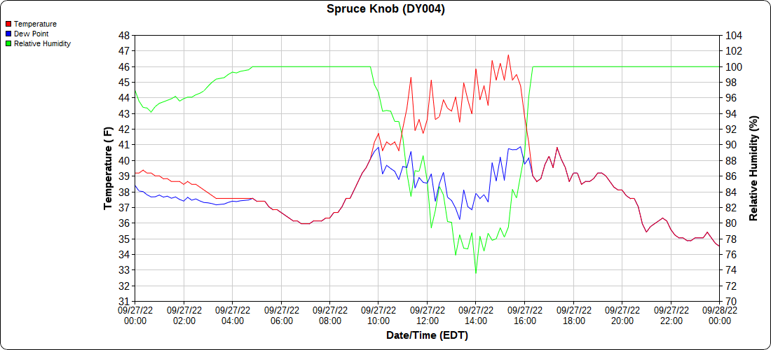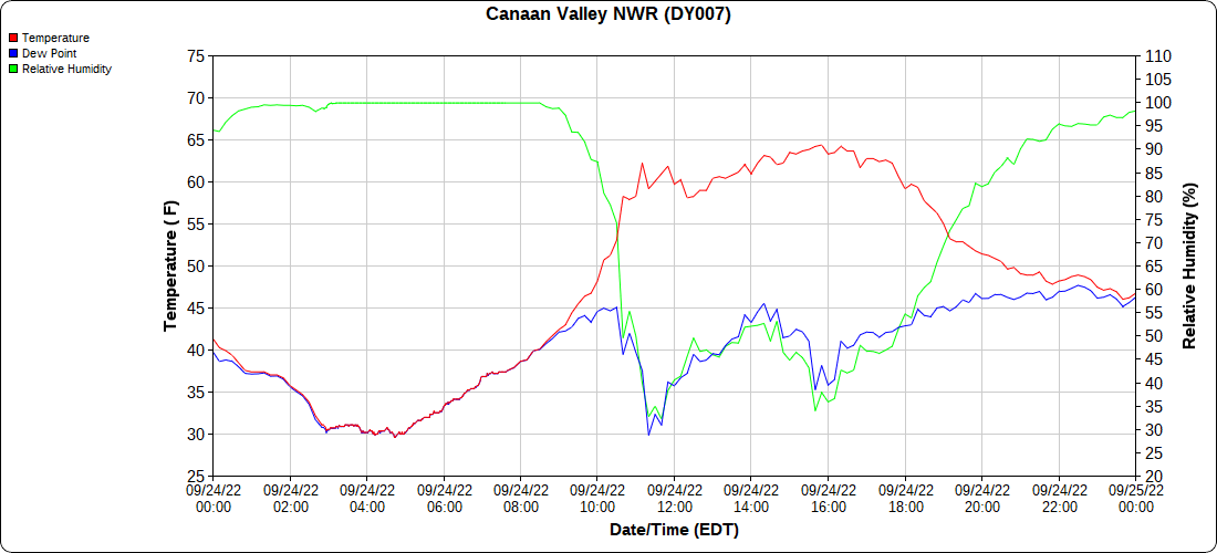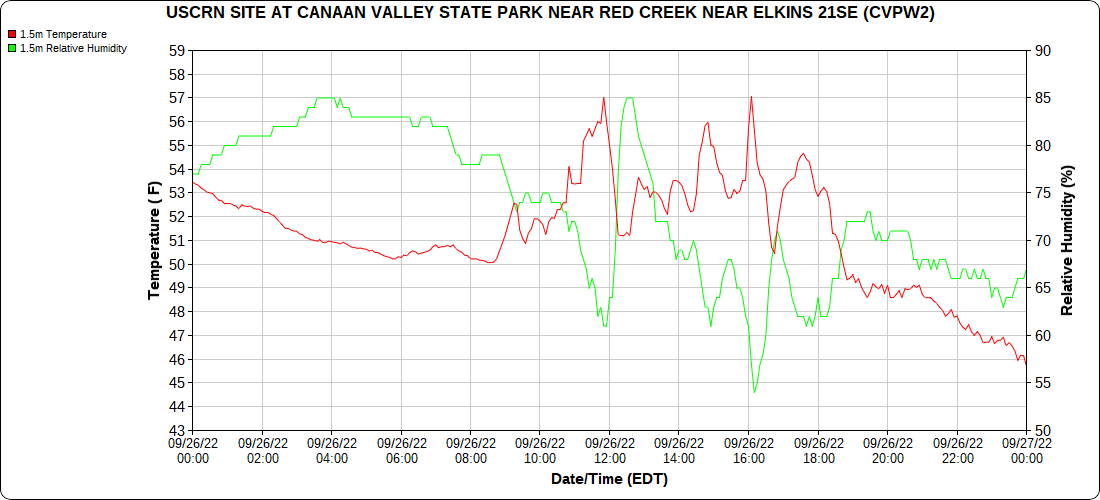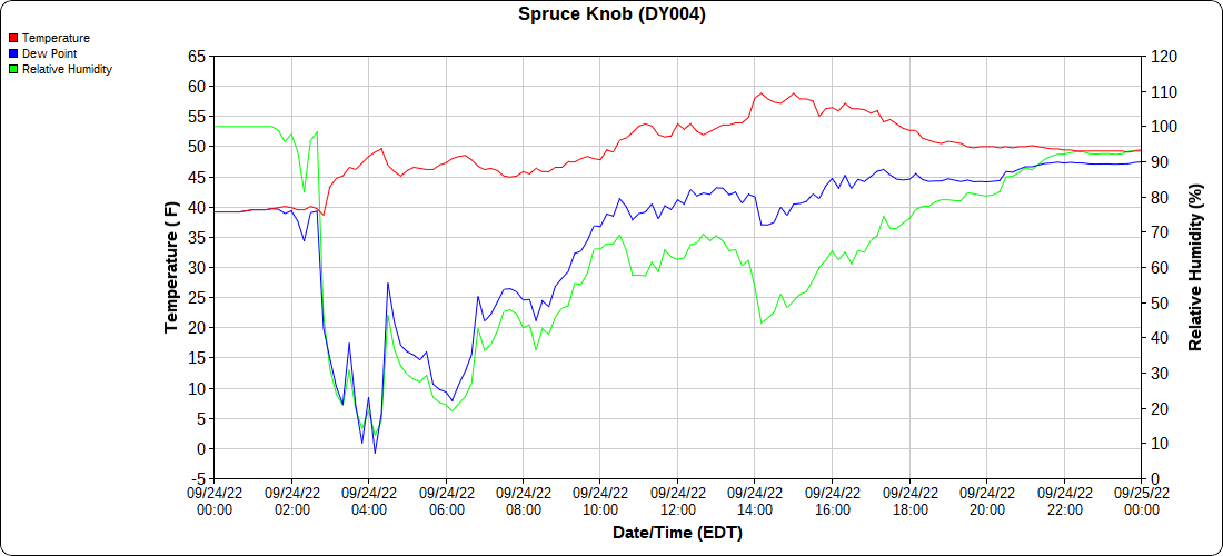 Dy007-Canaan Valley Refuge 3150′, Dy002-Cabin Mt at Bald Knob 4350′, Dy003-Cabin Mt-Western Sods 4035′, Dy004-Spruce Knob 4820′, Cvpw2-Climate Reference Network Canaan 3380′, KW99-Petersburg Grant County Airport 961, K2G4 Garrett County Airport 2933′, KCBE Cumberland Airport 774′, KEKN Elkins Airport 1985′, KMGW Morgantown Airport 1227′, PMN16-Mt.Davis 3038′