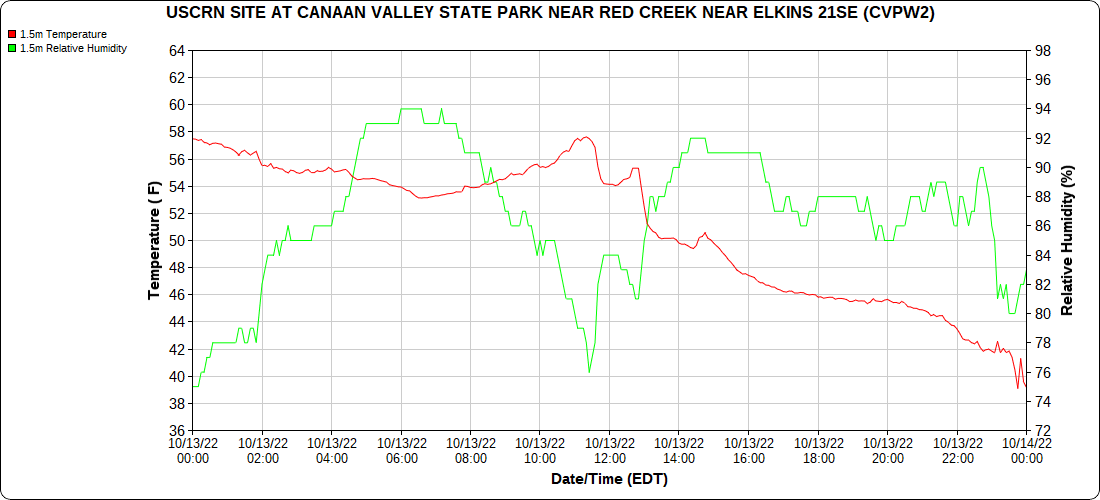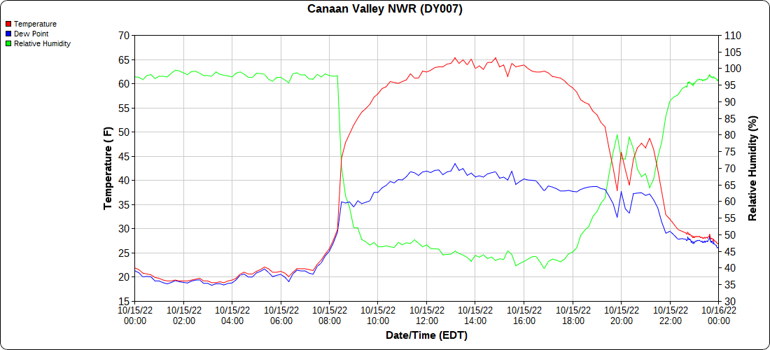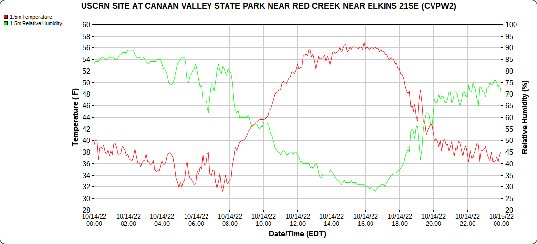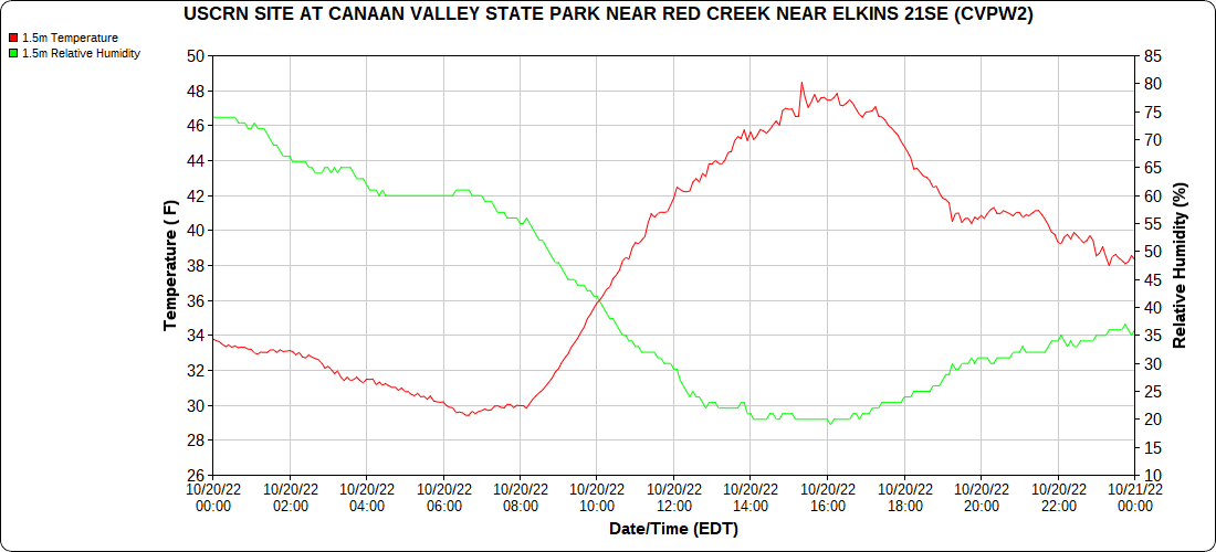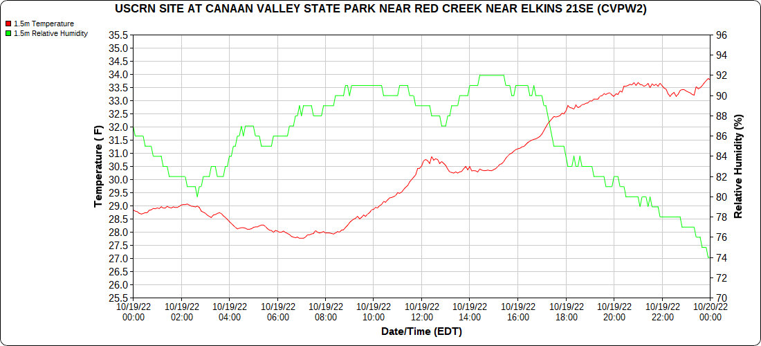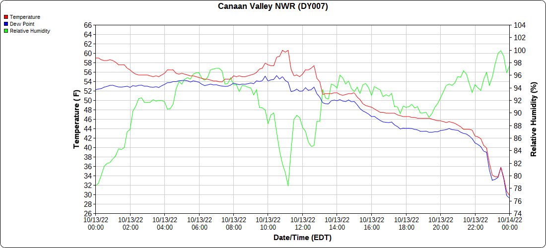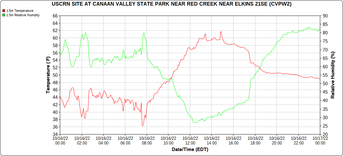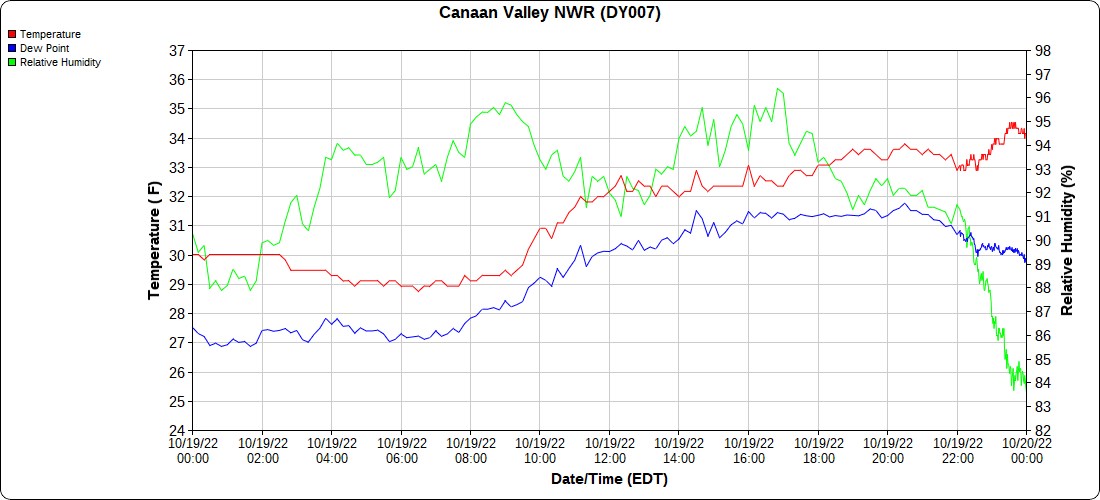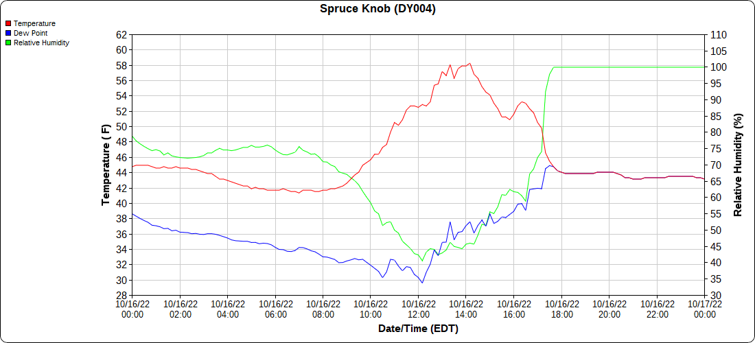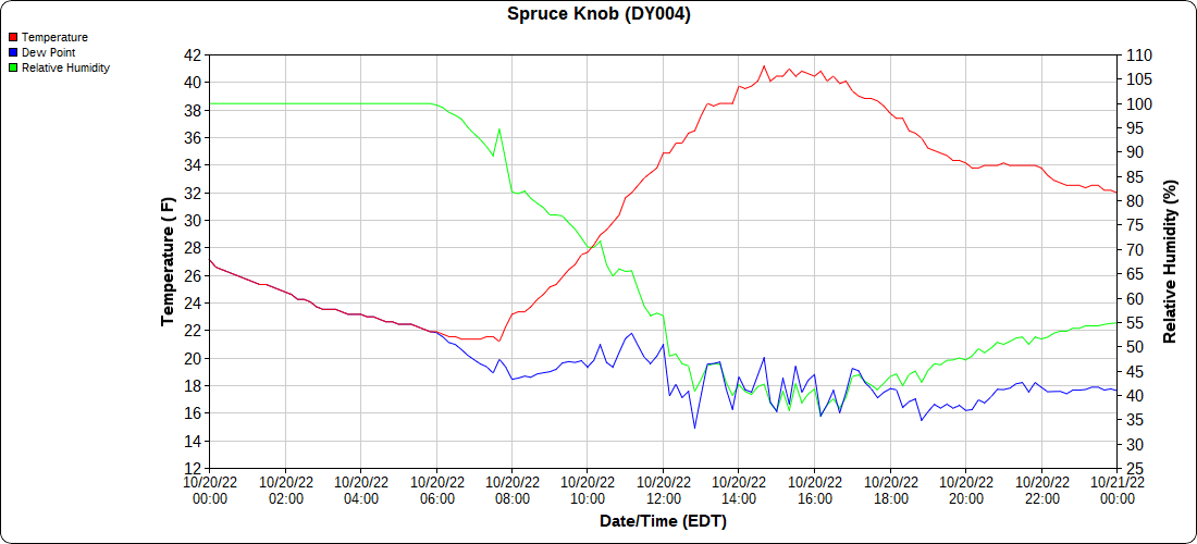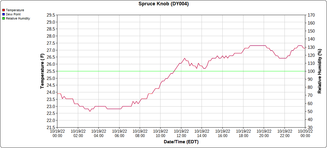 Dy007-Canaan Valley Refuge 3150′, Dy002-Cabin Mt at Bald Knob 4350′, Dy003-Cabin Mt-Western Sods 4035′, Dy004-Spruce Knob 4820′, Cvpw2-Climate Reference Network Canaan 3380′, KW99-Petersburg Grant County Airport 961, K2G4 Garrett County Airport 2933′, KCBE Cumberland Airport 774′, KEKN Elkins Airport 1985′, KMGW Morgantown Airport 1227′, PMN16-Mt.Davis 3038′
