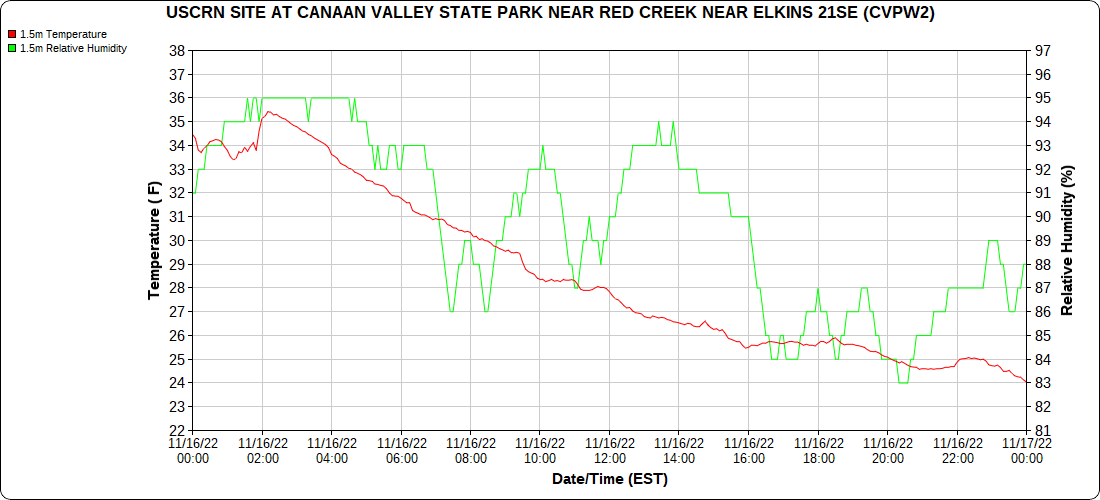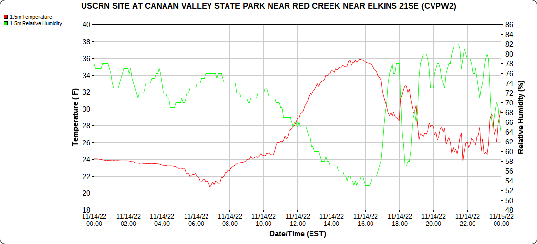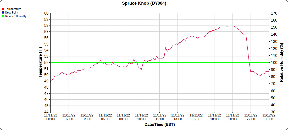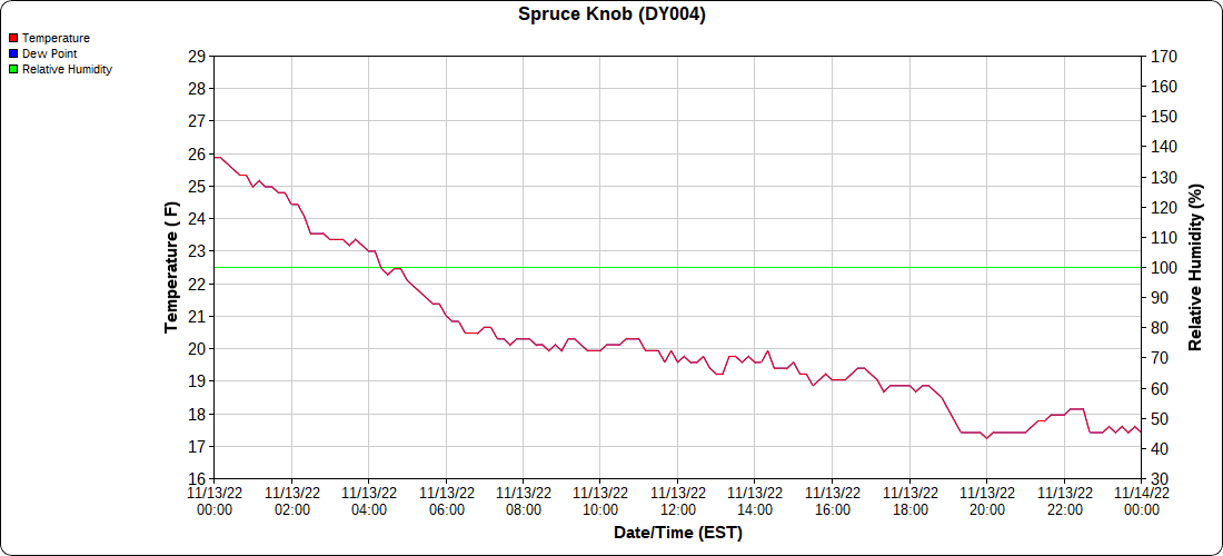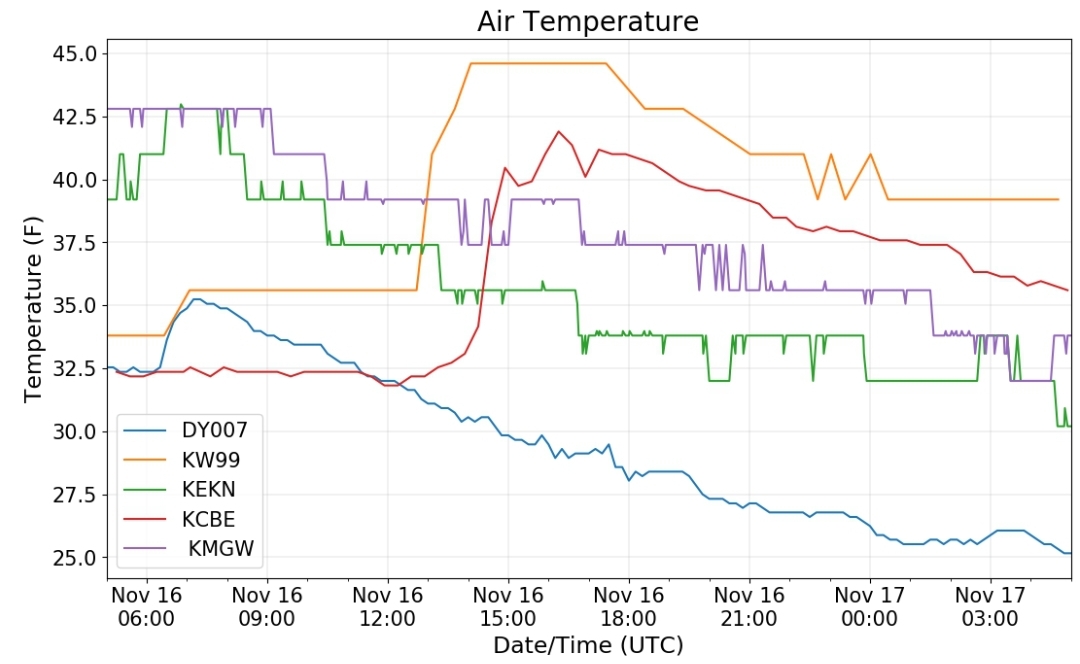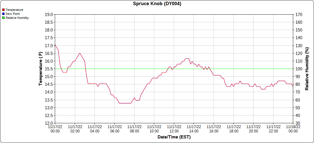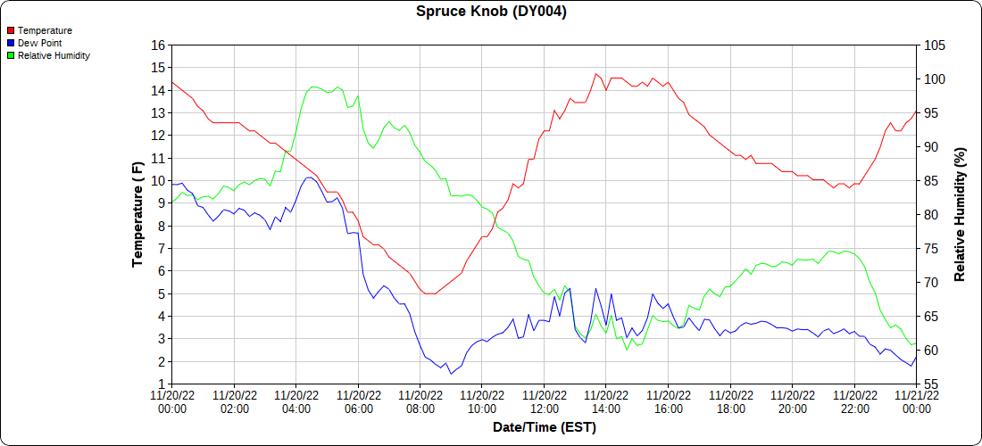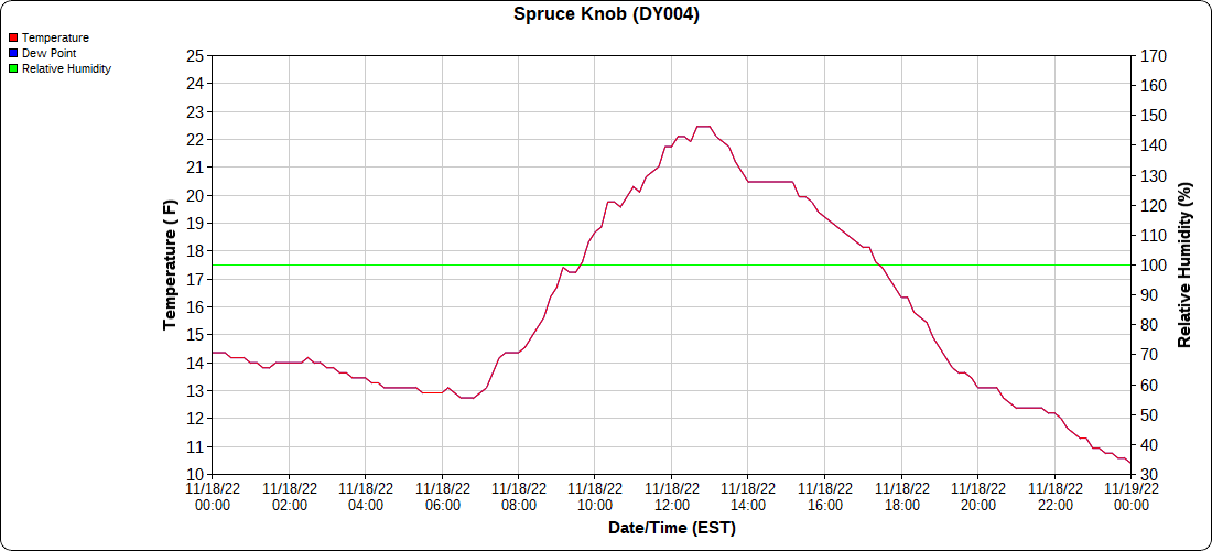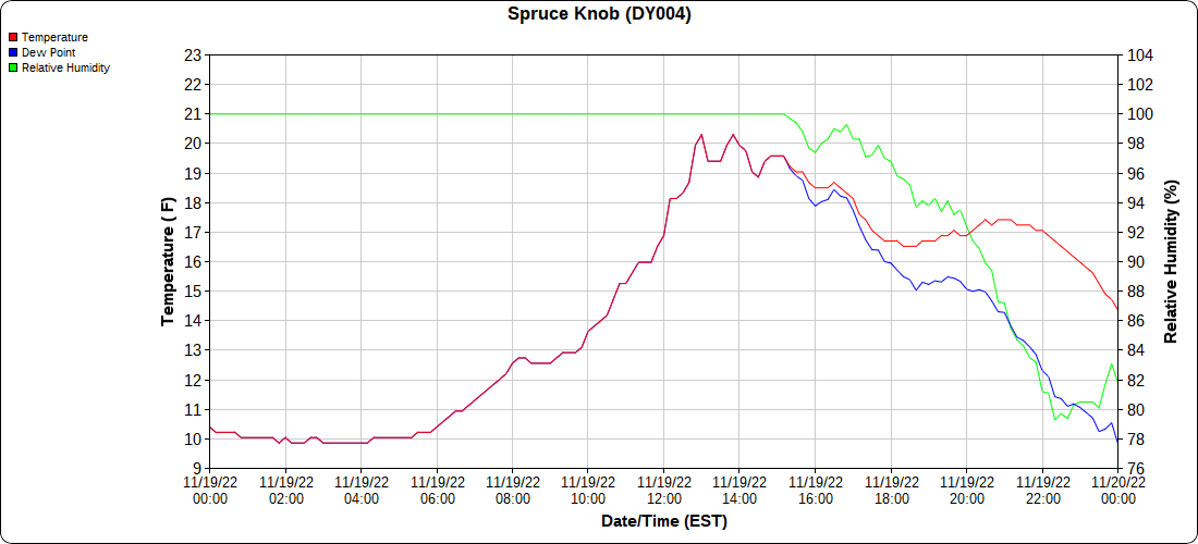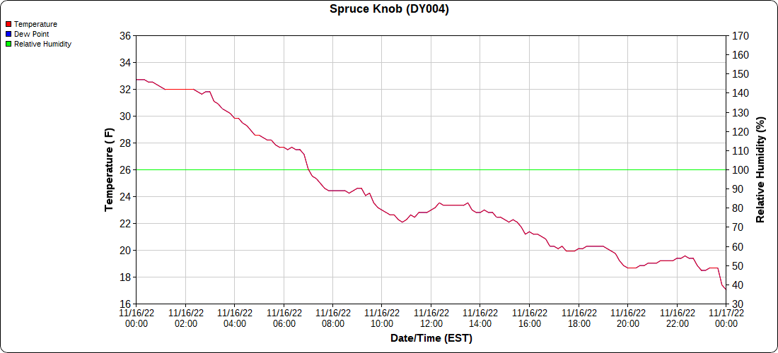 Dy007-Canaan Valley Refuge 3150′, Dy002-Cabin Mt at Bald Knob 4350′, Dy003-Cabin Mt-Western Sods 4035′, Dy004-Spruce Knob 4820′, Cvpw2-Climate Reference Network Canaan 3380′, KW99-Petersburg Grant County Airport 961, K2G4 Garrett County Airport 2933′, KCBE Cumberland Airport 774′, KEKN Elkins Airport 1985′, KMGW Morgantown Airport 1227′, PMN16-Mt.Davis 3038′