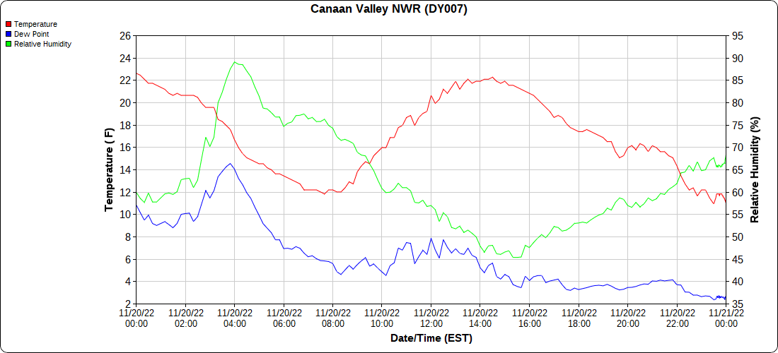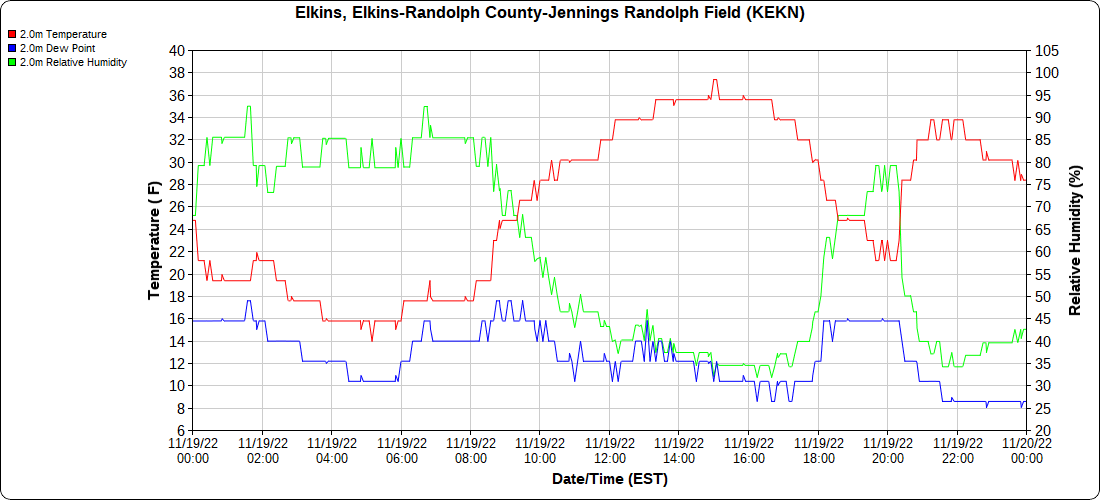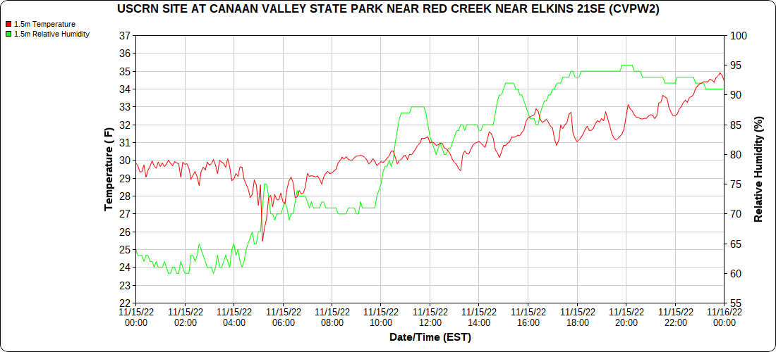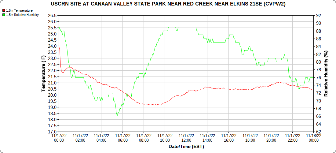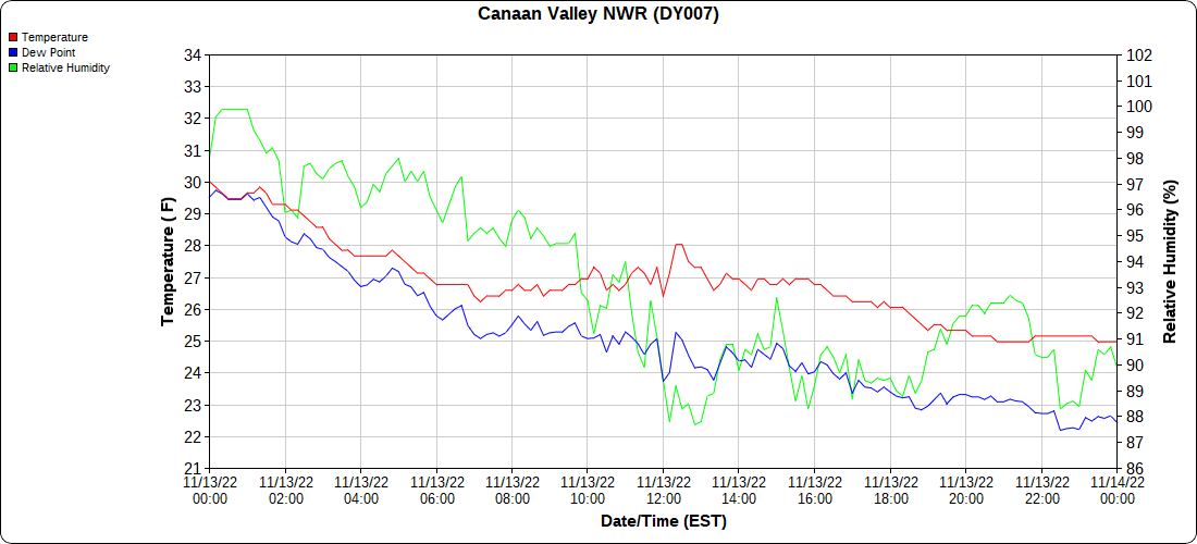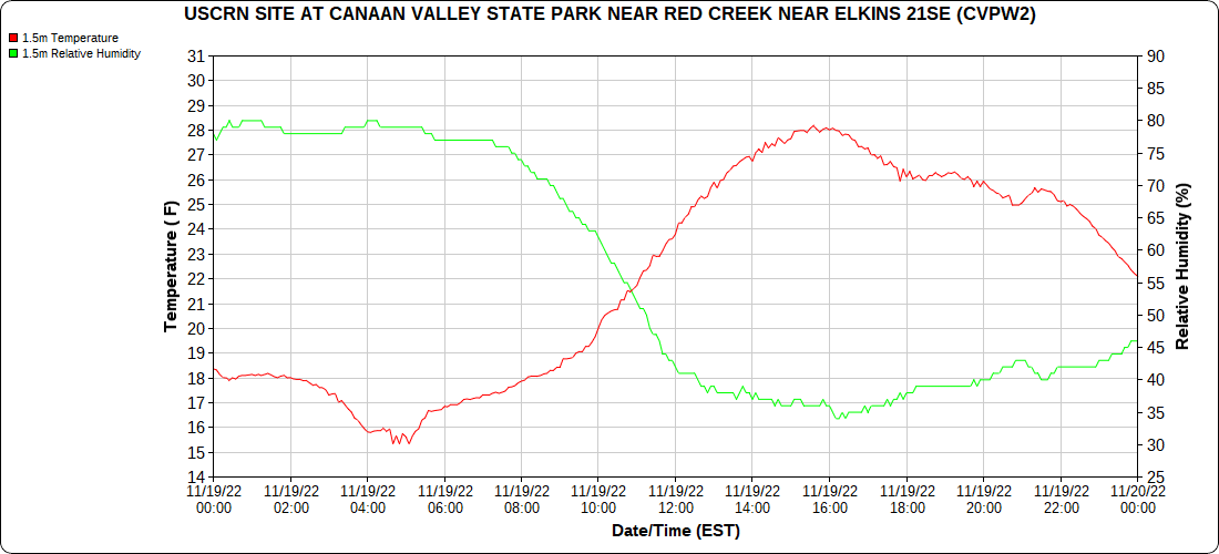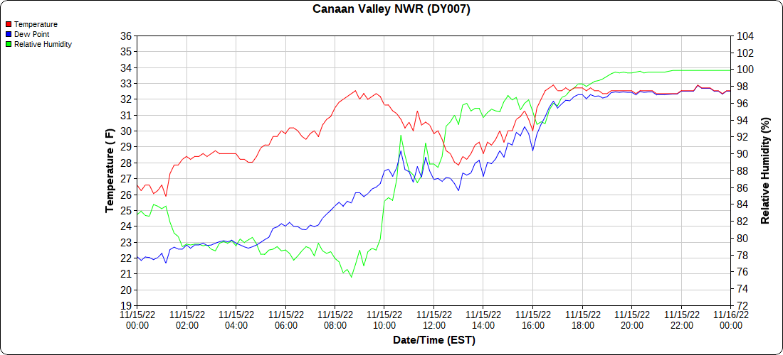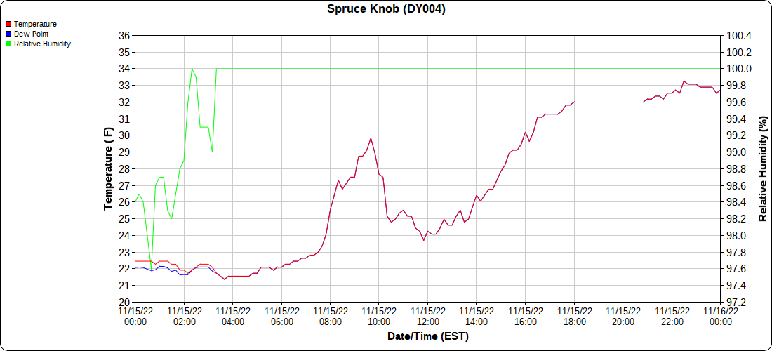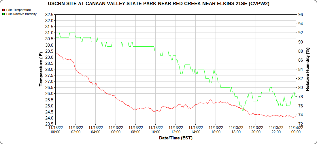 Dy007-Canaan Valley Refuge 3150′, Dy002-Cabin Mt at Bald Knob 4350′, Dy003-Cabin Mt-Western Sods 4035′, Dy004-Spruce Knob 4820′, Cvpw2-Climate Reference Network Canaan 3380′, KW99-Petersburg Grant County Airport 961, K2G4 Garrett County Airport 2933′, KCBE Cumberland Airport 774′, KEKN Elkins Airport 1985′, KMGW Morgantown Airport 1227′, PMN16-Mt.Davis 3038′