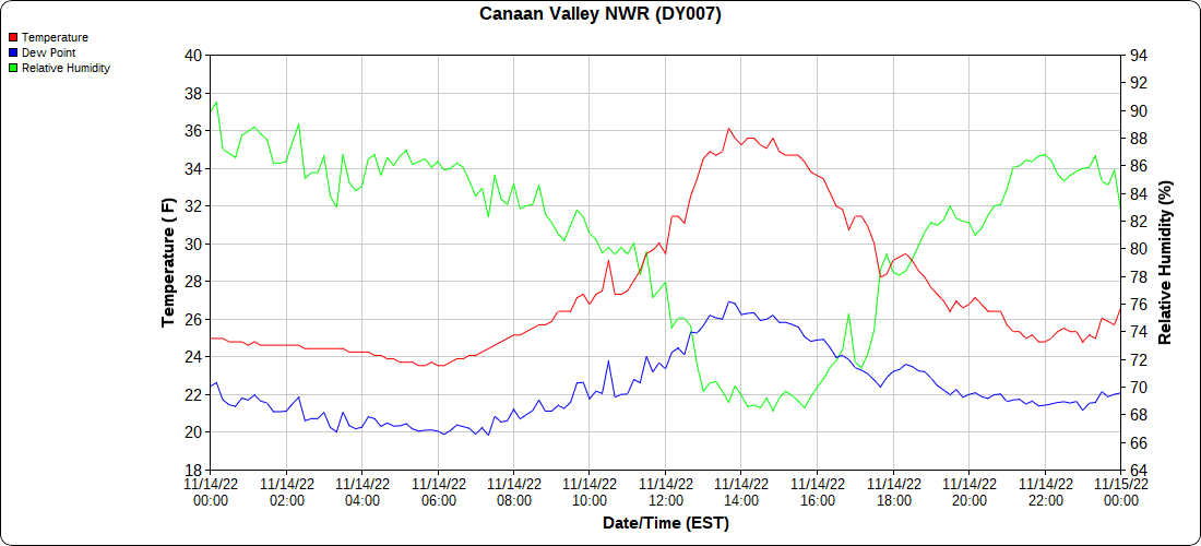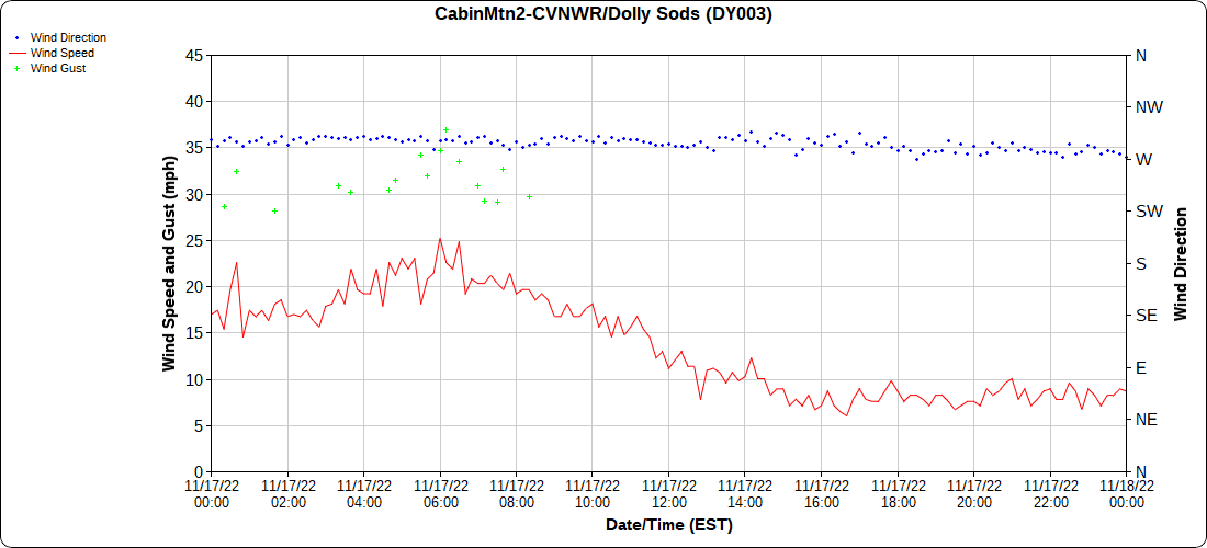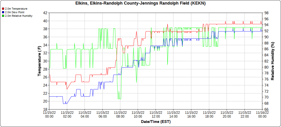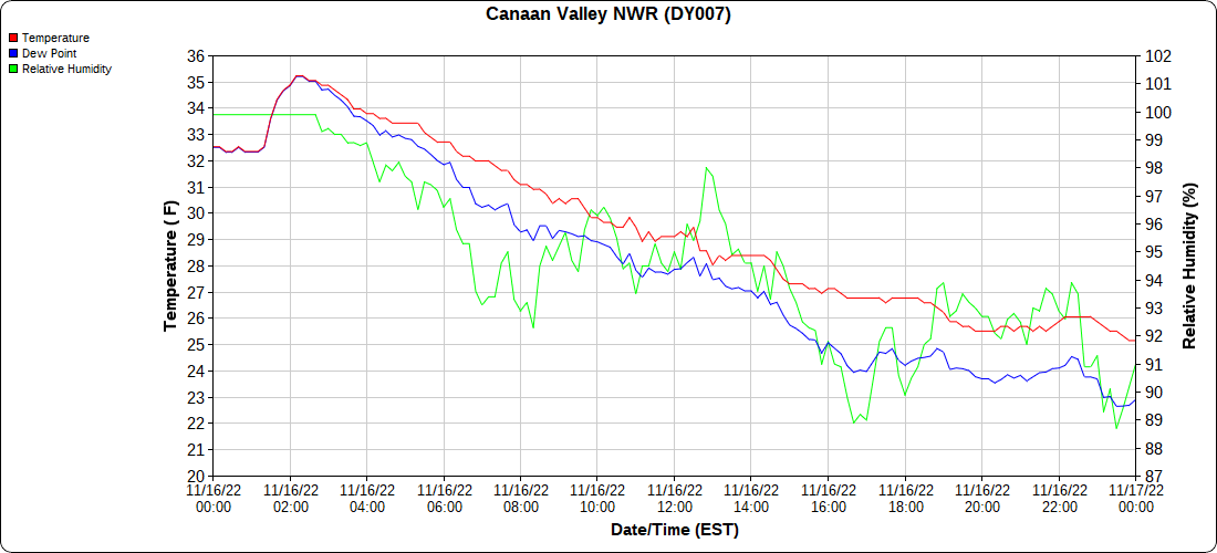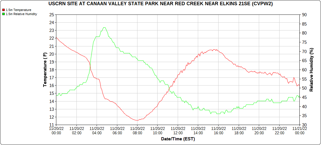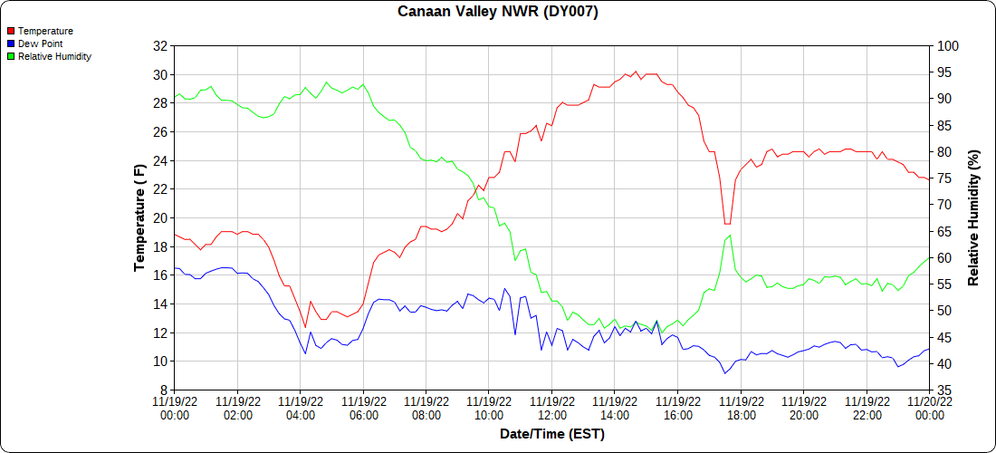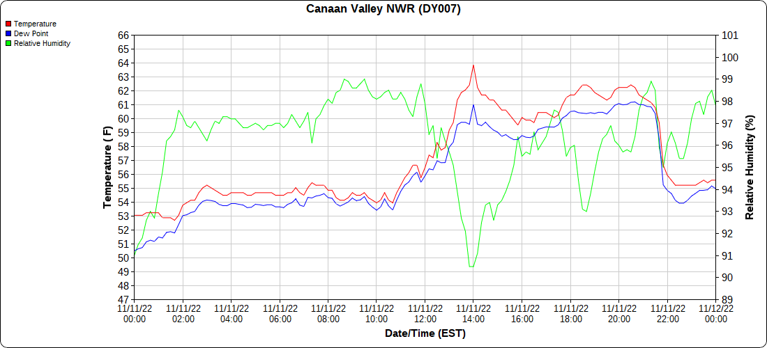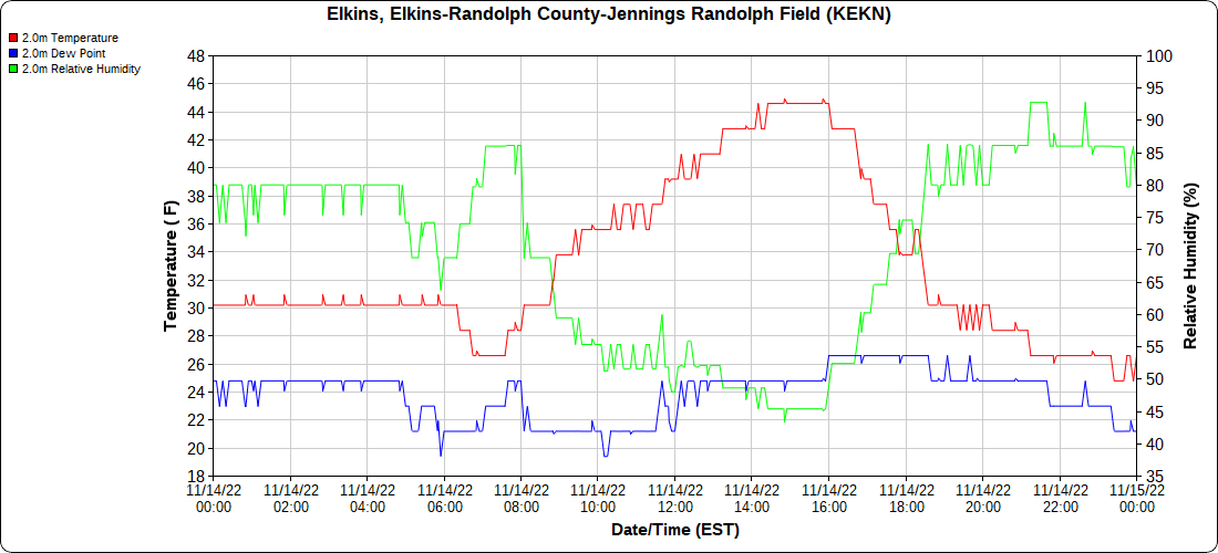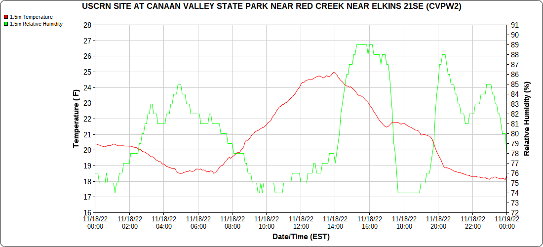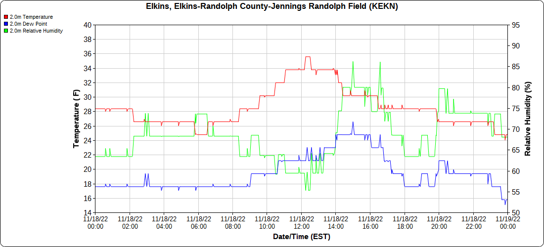 Dy007-Canaan Valley Refuge 3150′, Dy002-Cabin Mt at Bald Knob 4350′, Dy003-Cabin Mt-Western Sods 4035′, Dy004-Spruce Knob 4820′, Cvpw2-Climate Reference Network Canaan 3380′, KW99-Petersburg Grant County Airport 961, K2G4 Garrett County Airport 2933′, KCBE Cumberland Airport 774′, KEKN Elkins Airport 1985′, KMGW Morgantown Airport 1227′, PMN16-Mt.Davis 3038′