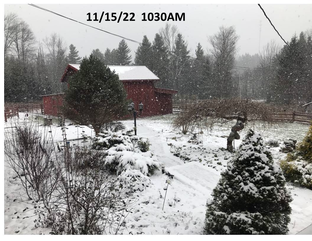 ” Rain ended overnight, then windy and turning colder again with light snowshowers beginning before daybreak and continuing as a very fine snow off and on all day. Temperatures slowly falling to the low 20s by nightfall. “