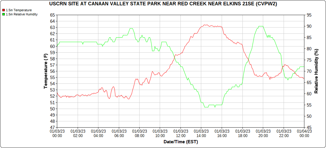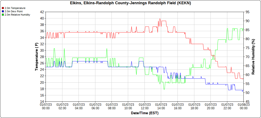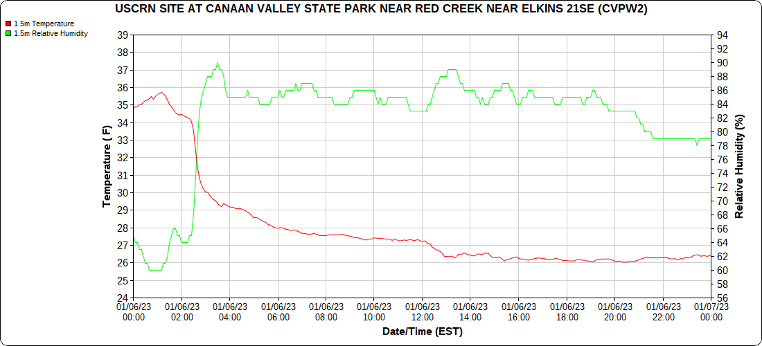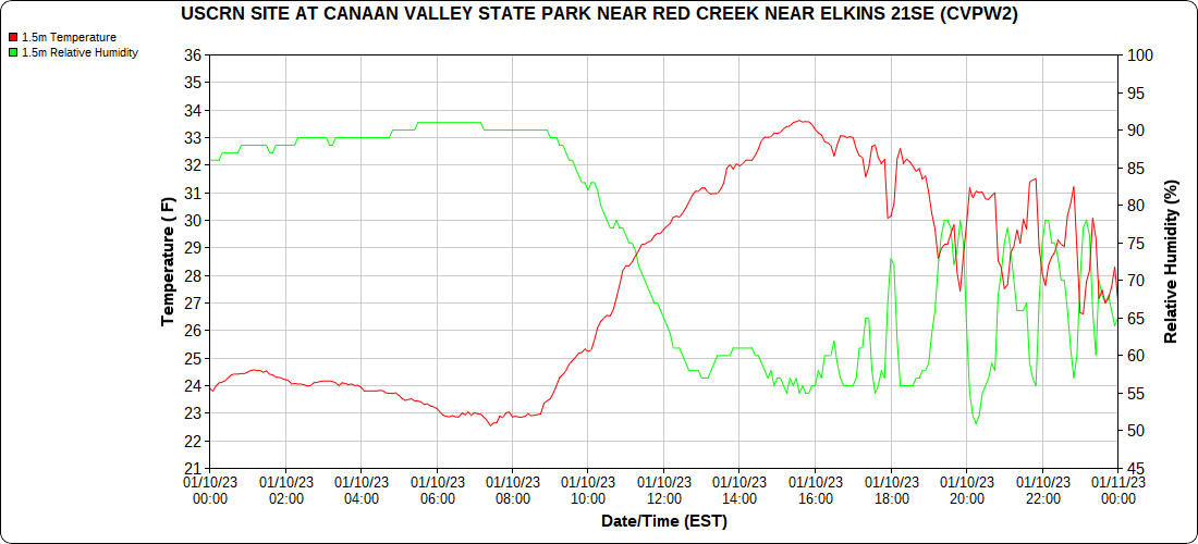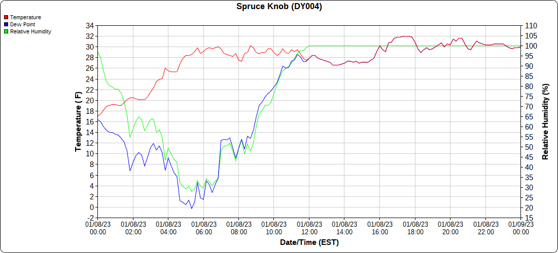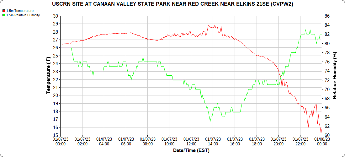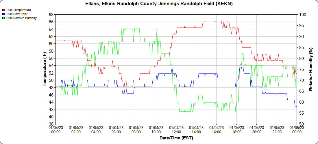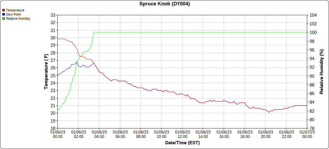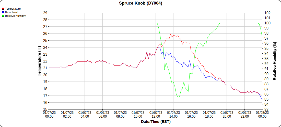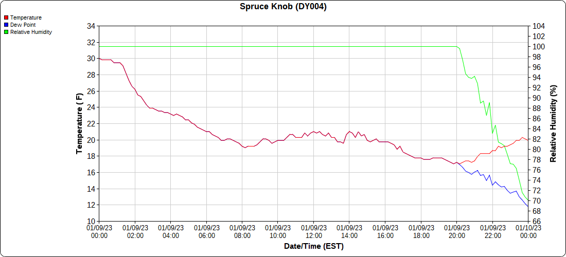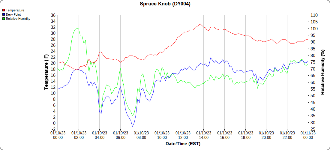 Dy007-Canaan Valley Refuge 3150′, Dy002-Cabin Mt at Bald Knob 4350′, Dy003-Cabin Mt-Western Sods 4035′, Dy004-Spruce Knob 4820′, Cvpw2-Climate Reference Network Canaan 3380′, KW99-Petersburg Grant County Airport 961, K2G4 Garrett County Airport 2933′, KCBE Cumberland Airport 774′, KEKN Elkins Airport 1985′, KMGW Morgantown Airport 1227′, PMN16-Mt.Davis 3038′, KDCA-Reagan National 15′