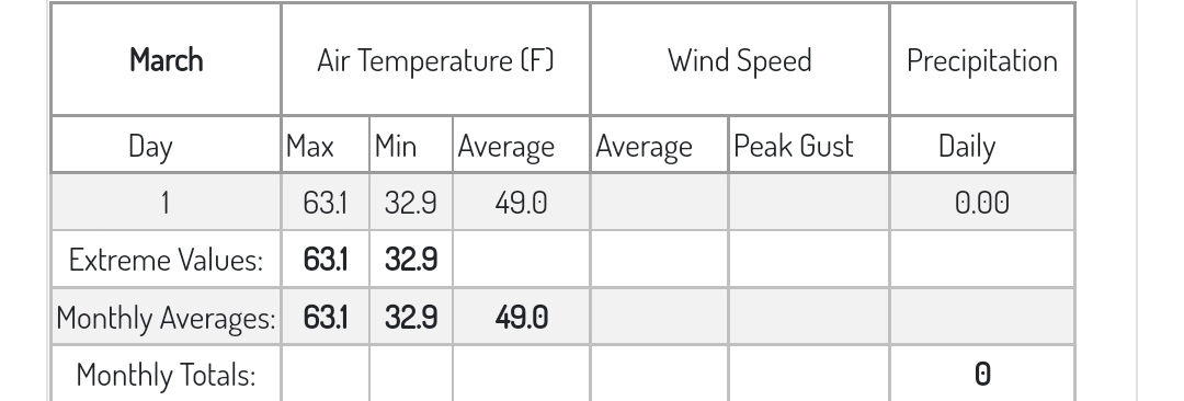 Wide open valley site at 3150′. I would suspect the dead brown ground coverage with limited days of snowcover aided in max temps on high solar days.
