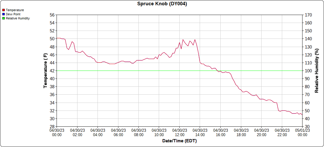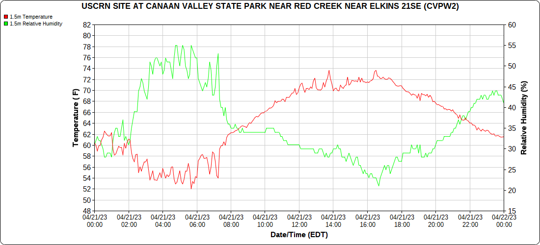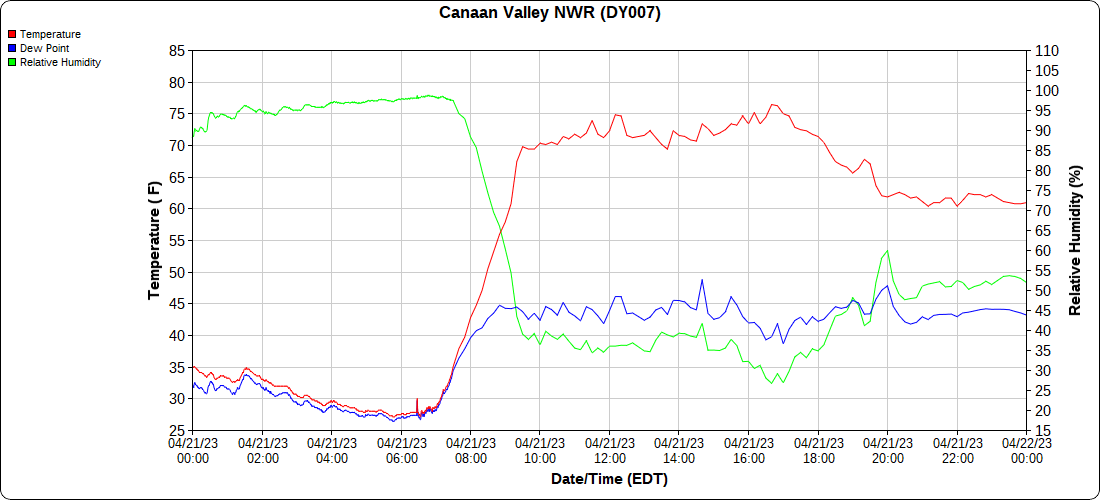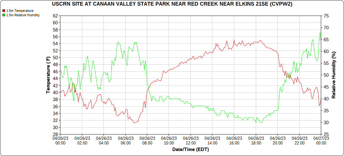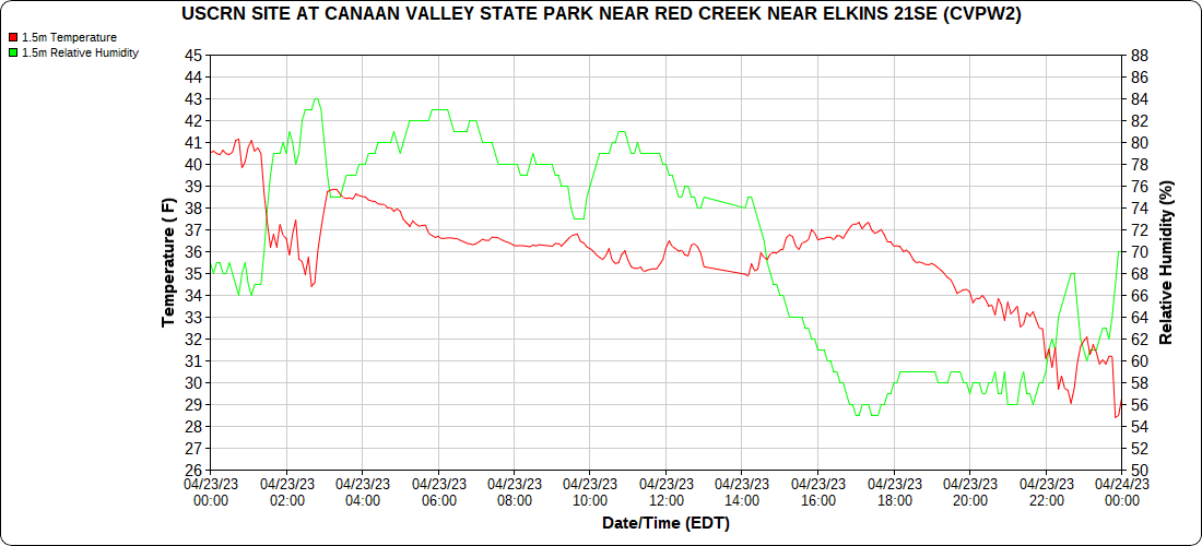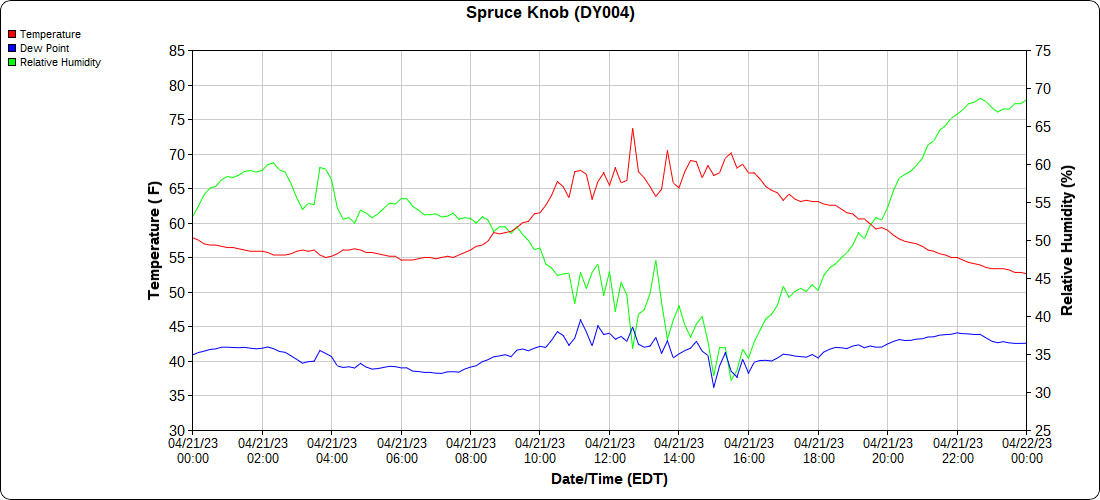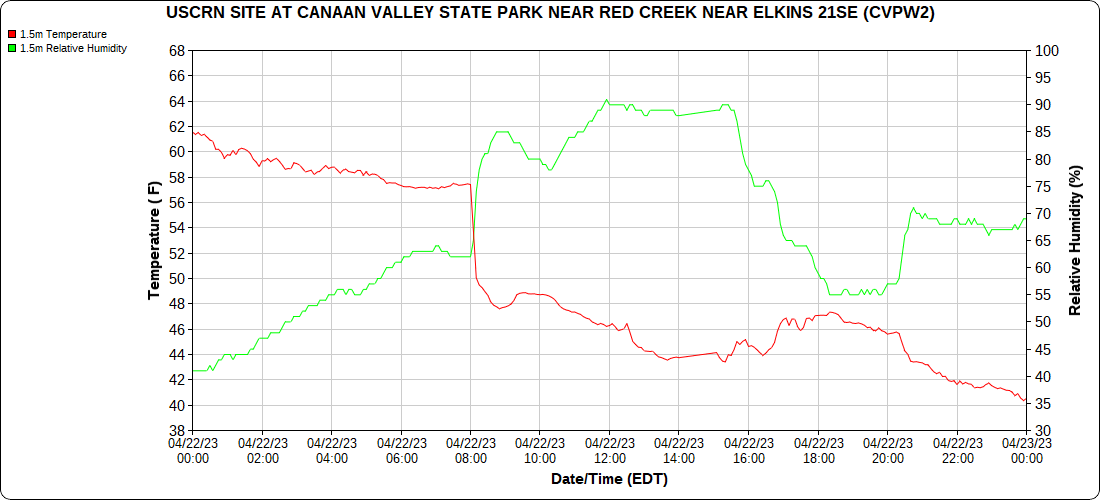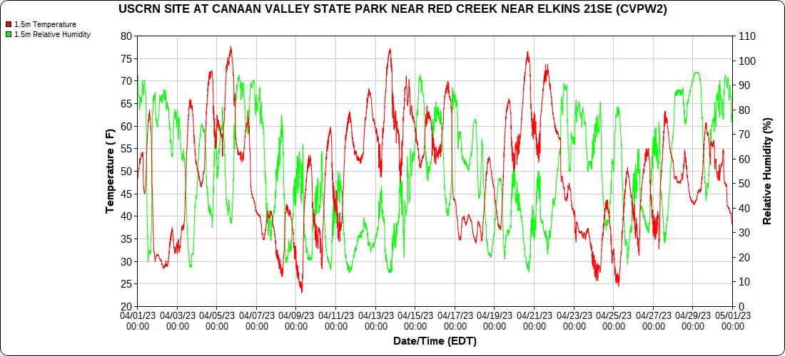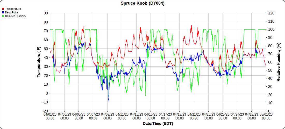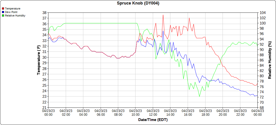 Dy007-Canaan Valley Refuge 3150′, Dy002-Cabin Mt at Bald Knob 4350′, Dy003-Cabin Mt-Western Sods 4035′, Dy004-Spruce Knob 4820′, Cvpw2-Climate Reference Network Canaan 3380′, KW99-Petersburg Grant County Airport 961, K2G4 Garrett County Airport 2933′, KCBE Cumberland Airport 774′, KEKN Elkins Airport 1985′, KMGW Morgantown Airport 1227′, PMN16-Mt.Davis 3038′, KDCA-Reagan National 15′, G1472 Snowshoe 4500′, F0183 Burkes Garden 3050′