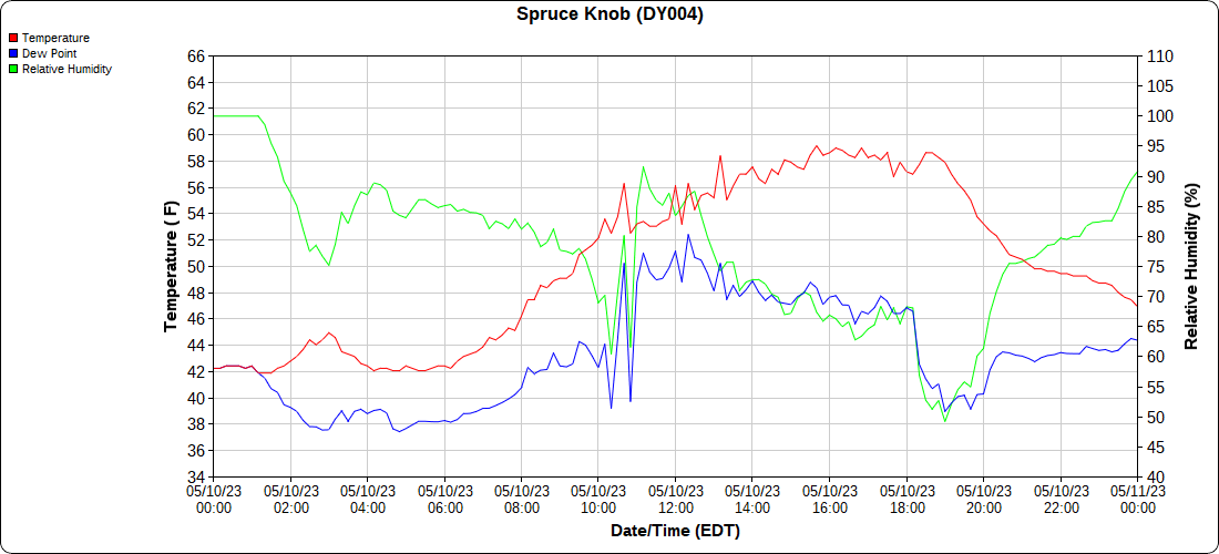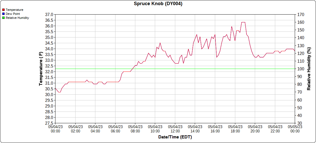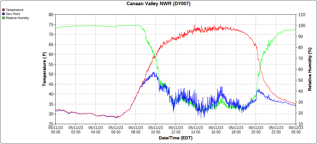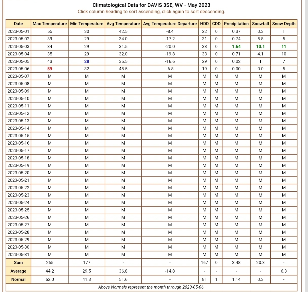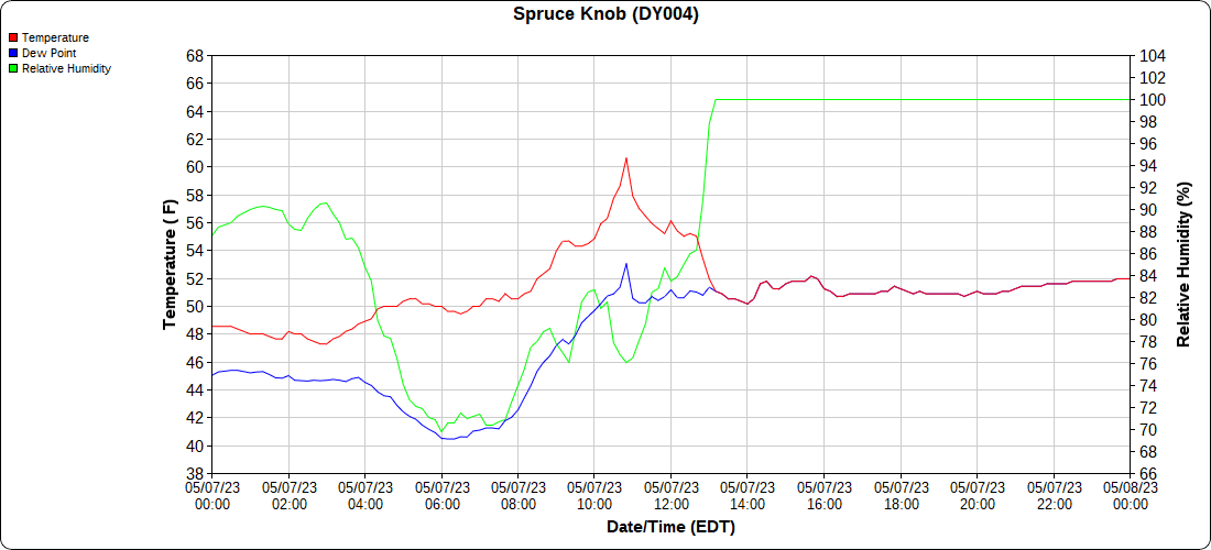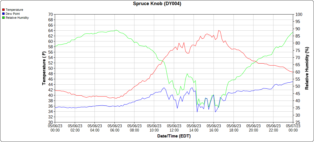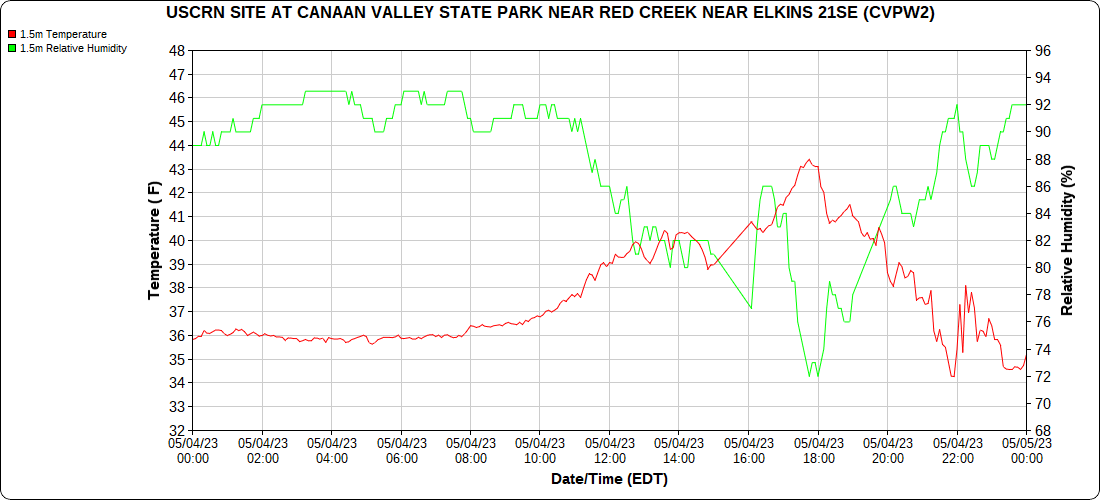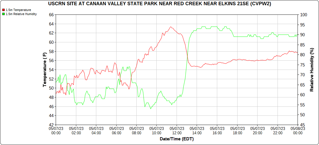 Dy007-Canaan Valley Refuge 3150′, Dy002-Cabin Mt at Bald Knob 4350′, Dy003-Cabin Mt-Western Sods 4035′, Dy004-Spruce Knob 4820′, Cvpw2-Climate Reference Network Canaan 3380′, KW99-Petersburg Grant County Airport 961, K2G4 Garrett County Airport 2933′, KCBE Cumberland Airport 774′, KEKN Elkins Airport 1985′, KMGW Morgantown Airport 1227′, PMN16-Mt.Davis 3038′, KDCA-Reagan National 15′, G1472 Snowshoe 4500′, F0183 Burkes Garden 3050′